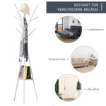 Ši stilinga ir funkcionali HOMCOM drabužių kabykla suteikia daug vietos paltams, krepšiams ir šalikams, kuriuos galima tvarkingai pakabinti ant 8 kabliukų. Be to, šis palto stovas turi lentyną priedams susidėti. MDF medžio ir metalo konstrukcija yra patvari ir stabili. Dėl gražaus ir modernaus dizaino drabužių kabykla yra puikus baldas bet kokiai įėjimo zonai.