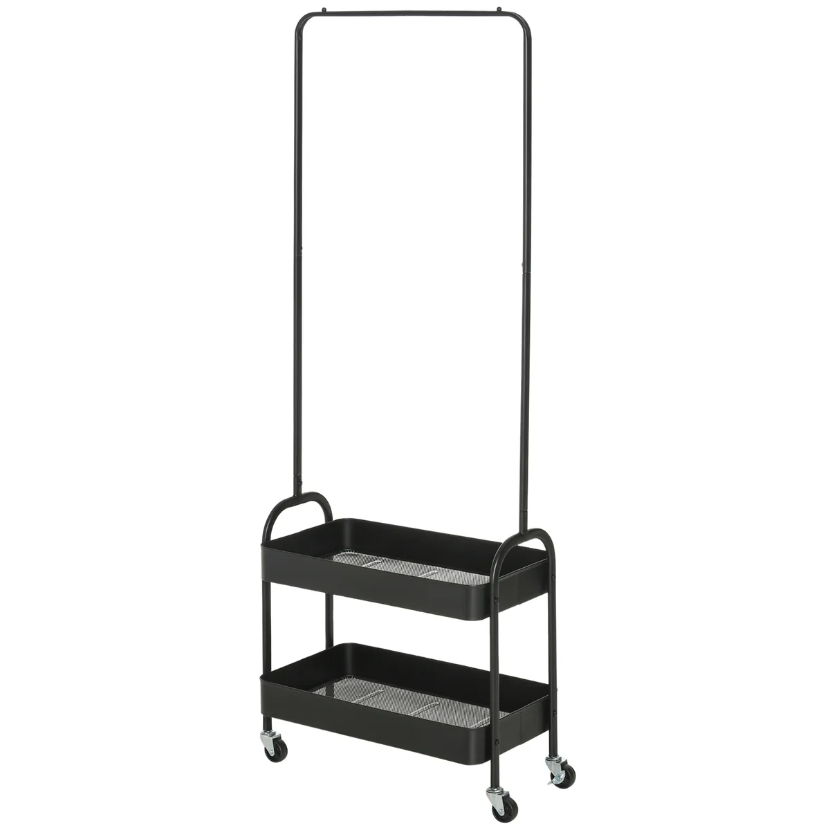 Ši mobili drabužių kabykla su lentyna iš HOMCOM optimizuoja vietos naudojimą. Jo kompaktiškas dydis idealiai tinka ribotoms erdvėms, pavyzdžiui, koridoriams ar rūbinėms. Tvirtas prieškambario rūbų kabyklos rėmas, pagamintas iš milteliniu būdu dažyto plieno, patikimai laiko paltus, striukes ir kitus drabužius. Dvi apatinės stovinčios kabyklos lentynos suteikia vietos batams ir krepšiams laikyti. Dėl keturių sklandžiai einančių ratų jį taip pat galima lengvai perkelti.