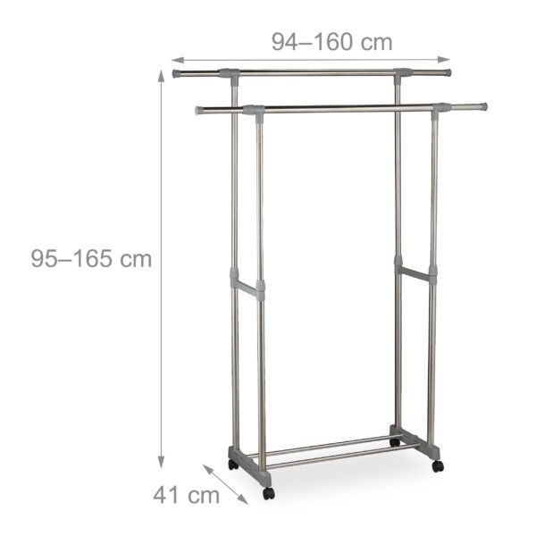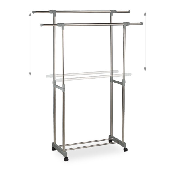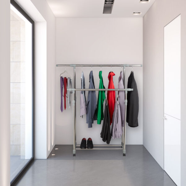 • Reguliuojami bėgeliai: Du drabužių bėgeliai, kurių aukštis ir plotis gali būti lengvai reguliuojami, suteikia pakankamai vietos įvairiems drabužiams – nuo marškinių iki suknelių.