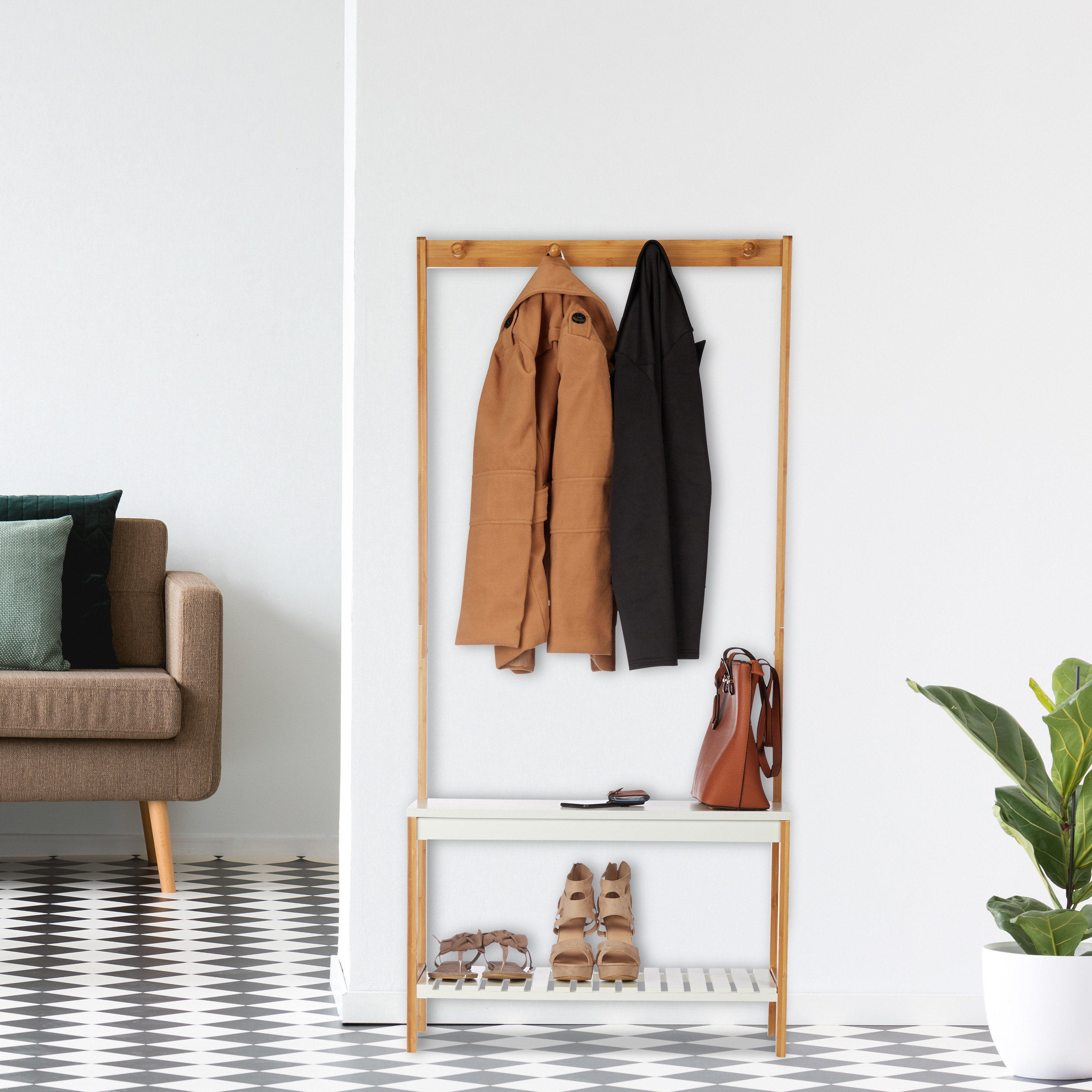 • Praktiškumas: 4 kabliukai leidžia patogiai pakabinti paltus ir striukes, o lentynos suteikia papildomą vietą rankinėms ir aksesuarams.