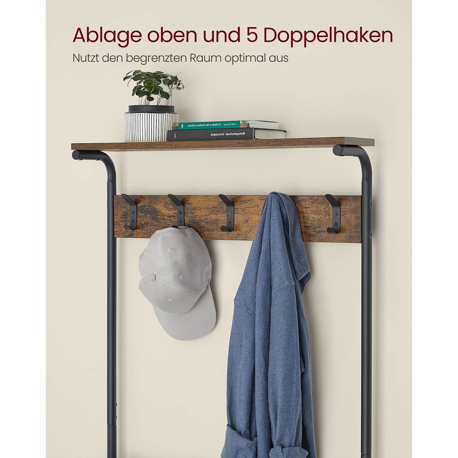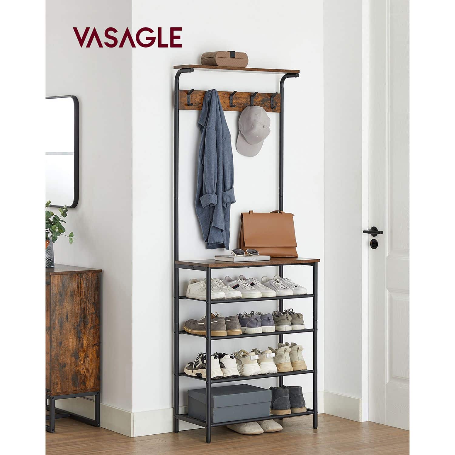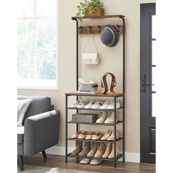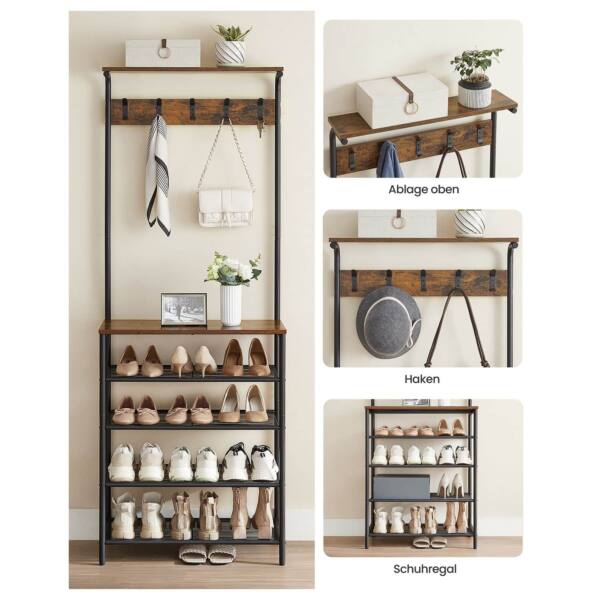 Ši drabužių kabykla su 5 batų lentynomis yra puikus pasirinkimas tiems, kurie vertina funkcionalumą ir stilių. Vintažinė ruda-juoda spalva suteikia elegancijos ir išskirtinumo jūsų interjerui.