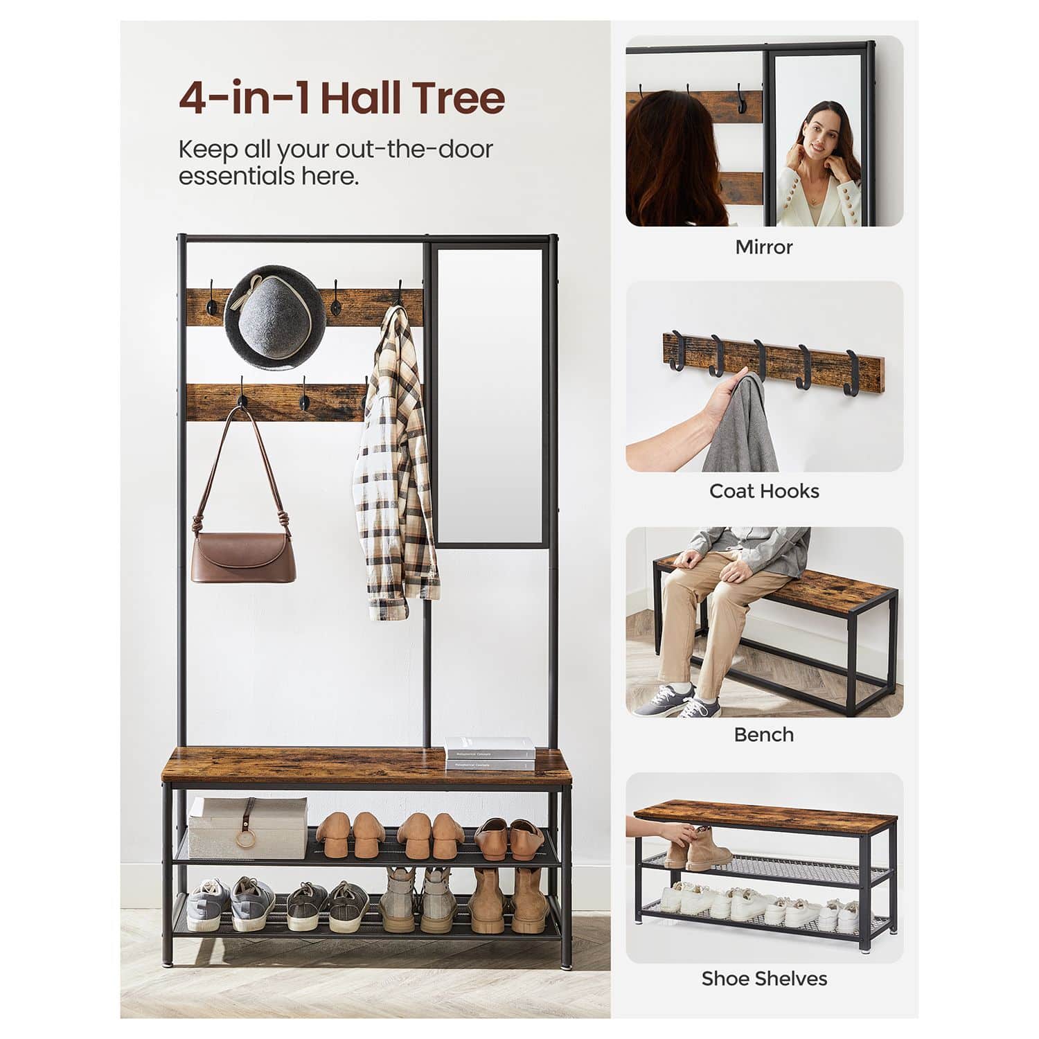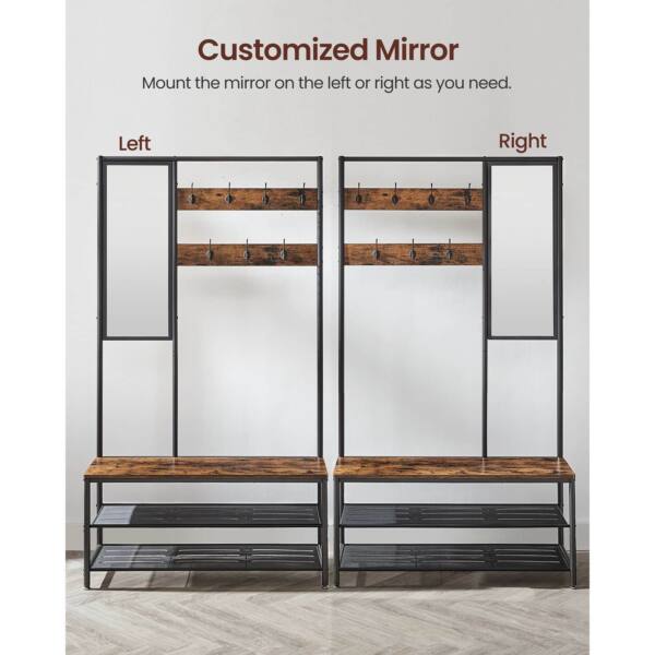 Drabužių kabykla su batų lentyna ir veidrodžiu, vintažinės – juodos spalvos, yra puikus sprendimas jūsų namų interjerui. Šis funkcionalus baldas ne tik padės tvarkingai laikyti drabužius ir batus, bet ir suteiks jūsų erdvei stilingą akcentą.