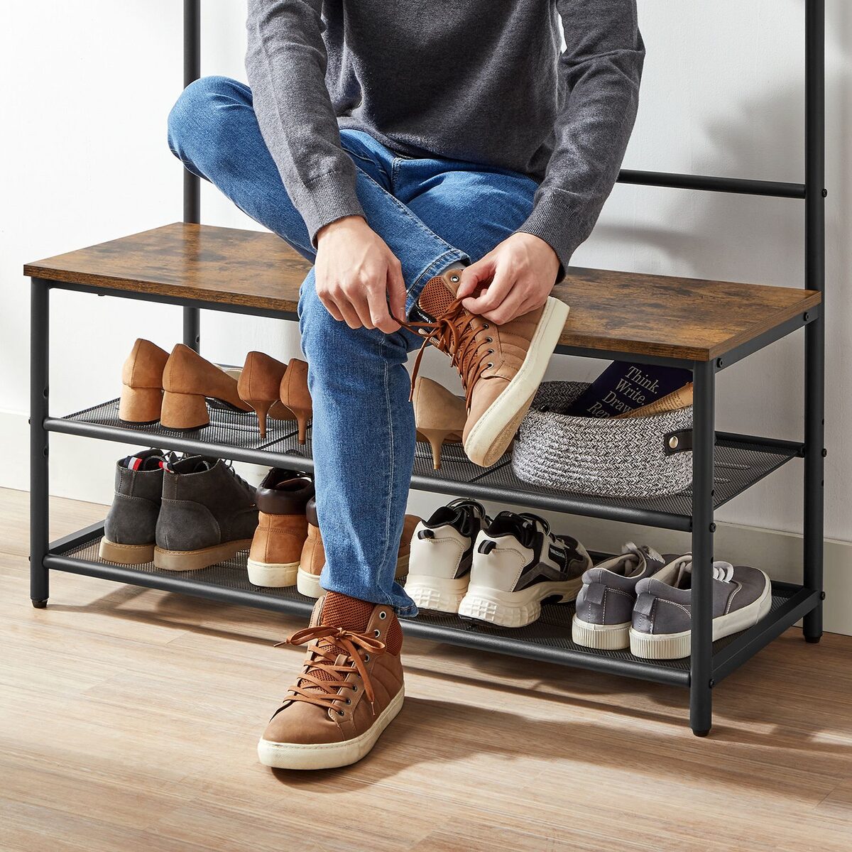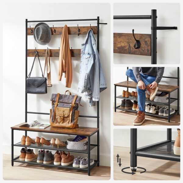 Drabužių kabykla su batų lentynomis ir suoliuku HSR410B01 yra puikus sprendimas jūsų namams. Šis funkcionalus baldas ne tik padės tvarkingai laikyti drabužius, bet ir suteiks vietą patogiai atsisėsti bei laikyti batus.