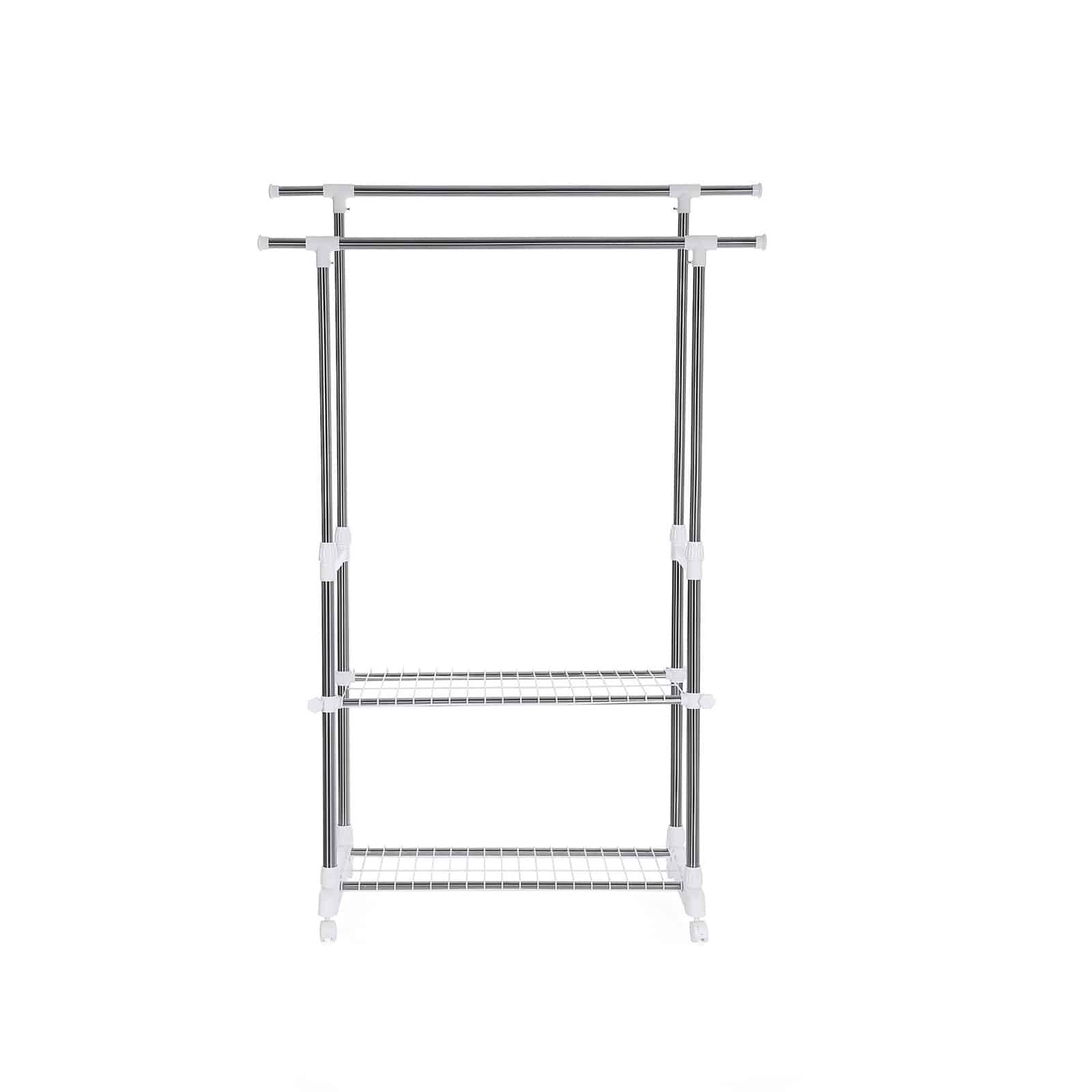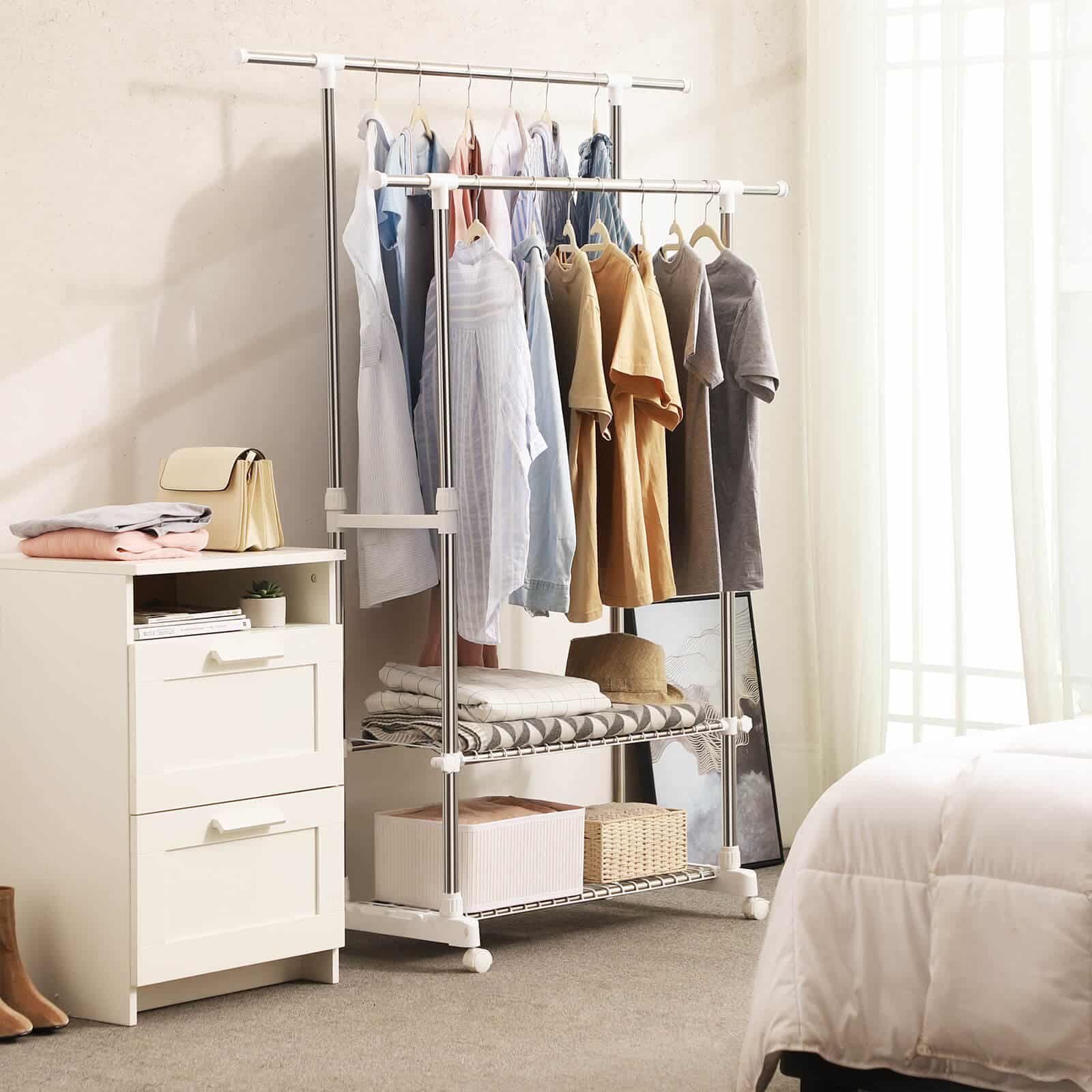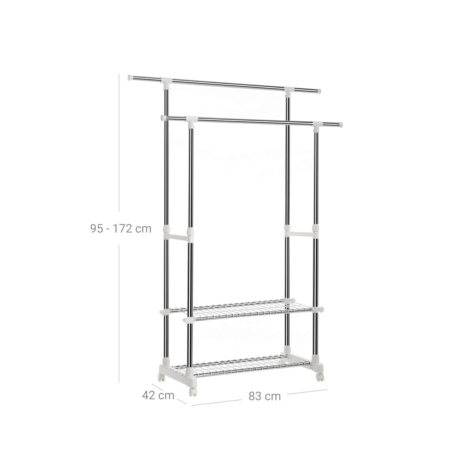 Itin lengva Songmics drabužių kabykla su batų skyriumi, baltos spalvos, dėl saugios ir stabilios konstrukcijos yra labai atspari, puikiai tinka kiekviename bute! Tvirtas rėmas pagamintas iš metalinių vamzdžių, padengtų nerūdijančiu plienu. Dvi drabužių kabyklos ir dvi tinklinės lentynos suteikia pakankamai vietos suknelėms, palaidinėms, krepšiams, skrybėlėms ir kitiems daiktams. Atstumas tarp dviejų trinkelių yra reguliuojamas, todėl jį galima optimaliai pritaikyti pagal jūsų poreikius. Jūsų daiktai gali būti tvarkingai ir lengvai pasiekiami.