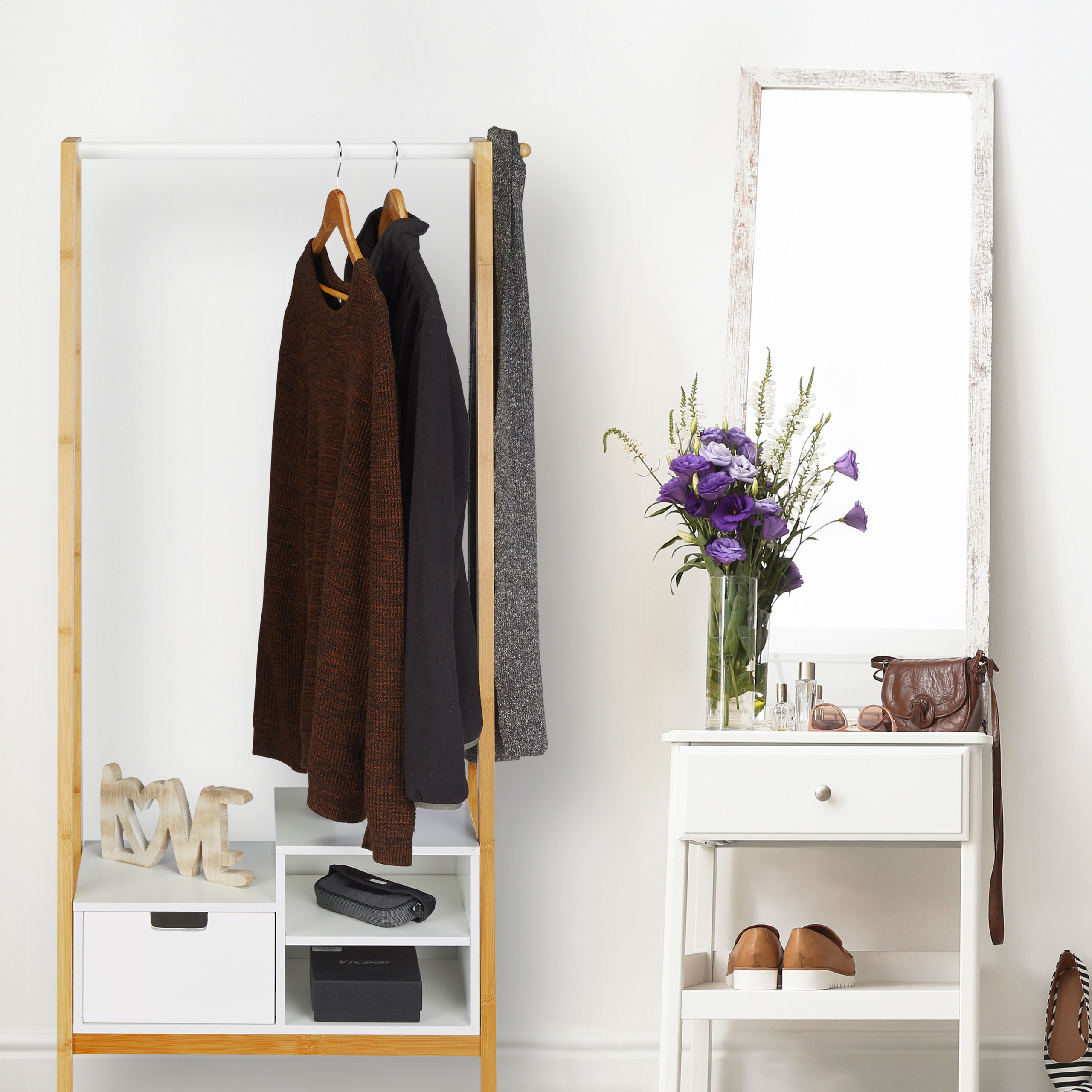- Funkcionalumas: Kabykla su lentyna leidžia patogiai laikyti ne tik drabužius, bet ir aksesuarus ar batus.