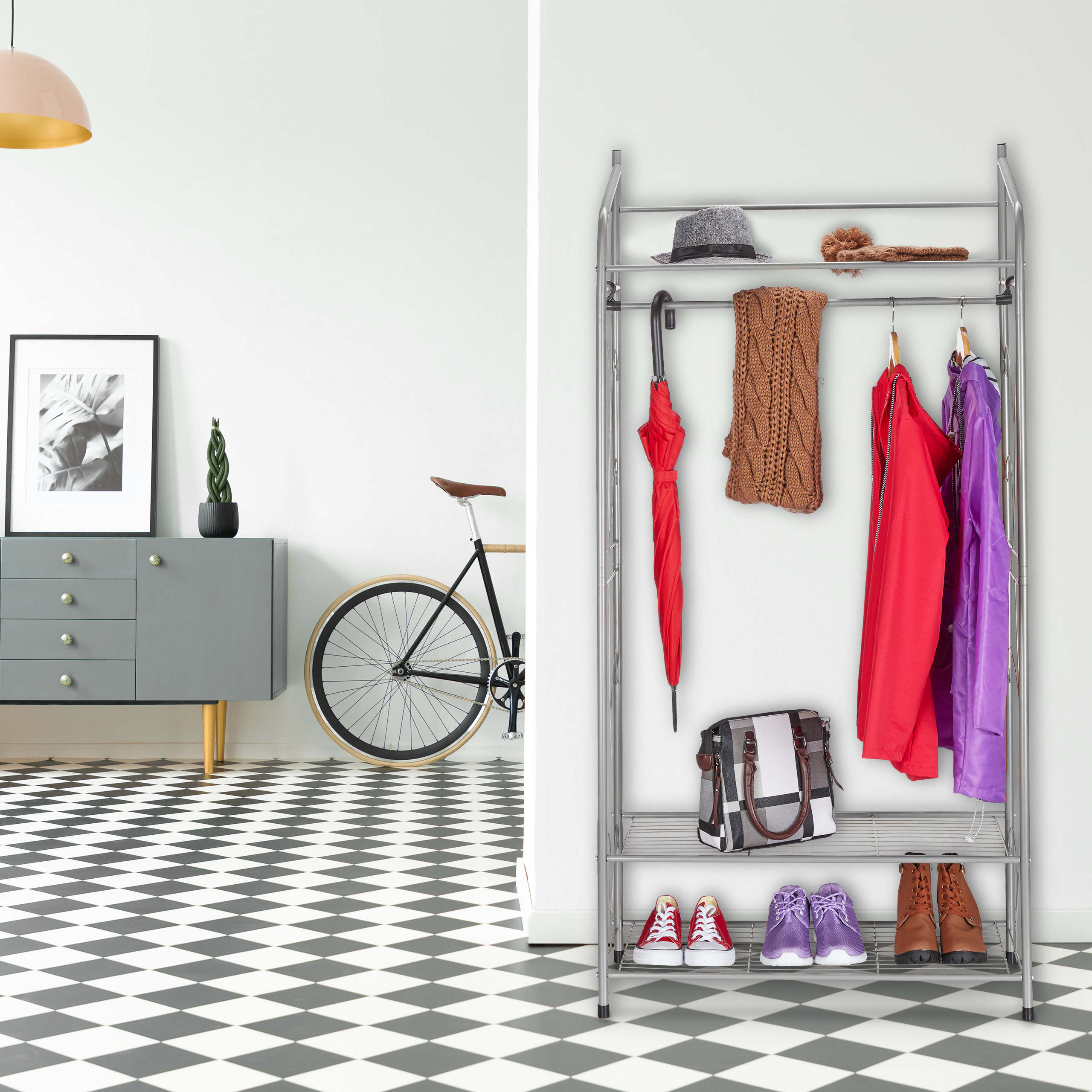 - Viršutinė lentyna: Idealiai tinka skrybėlėms, organizatorių dėžėms ar kitiems smulkiems daiktams laikyti.