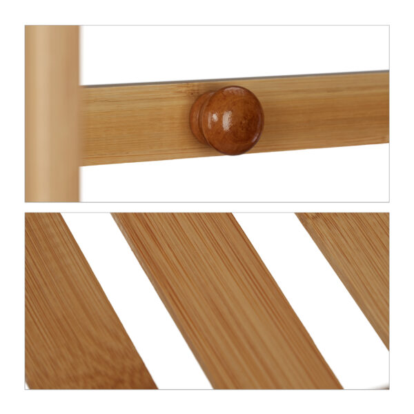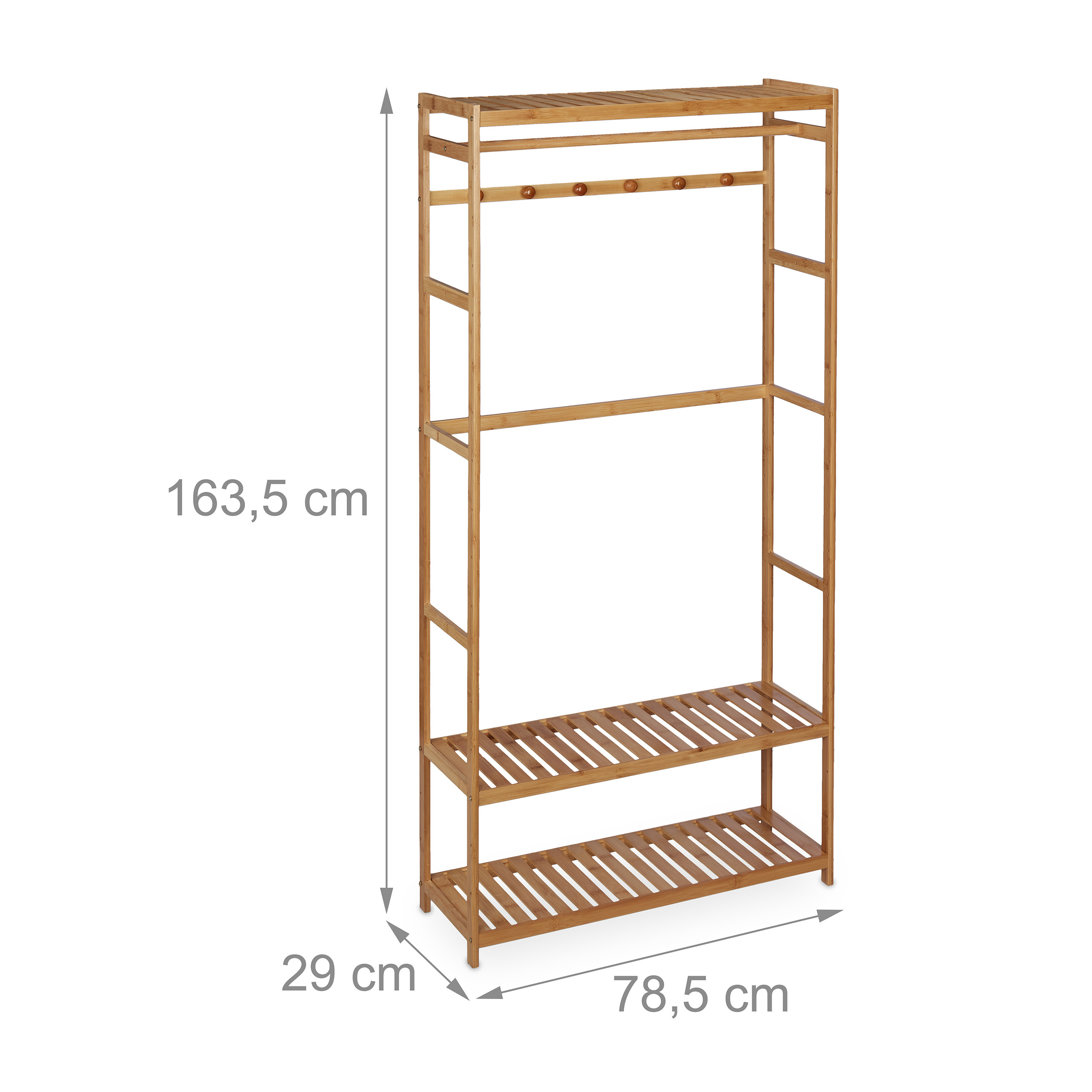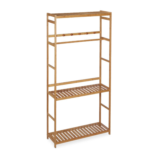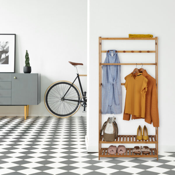 Ši elegantiška ir funkcionali drabužių kabykla yra puikus sprendimas tiek koridoriui, tiek miegamajam. Pagaminta iš aukštos kokybės bambuko, ji ne tik suteikia natūralų ir šiltą akcentą jūsų interjerui, bet ir užtikrina tvarkingą įėjimo zoną, kurioje lengvai rasite vietą batams, švarkams ar krepšiams.