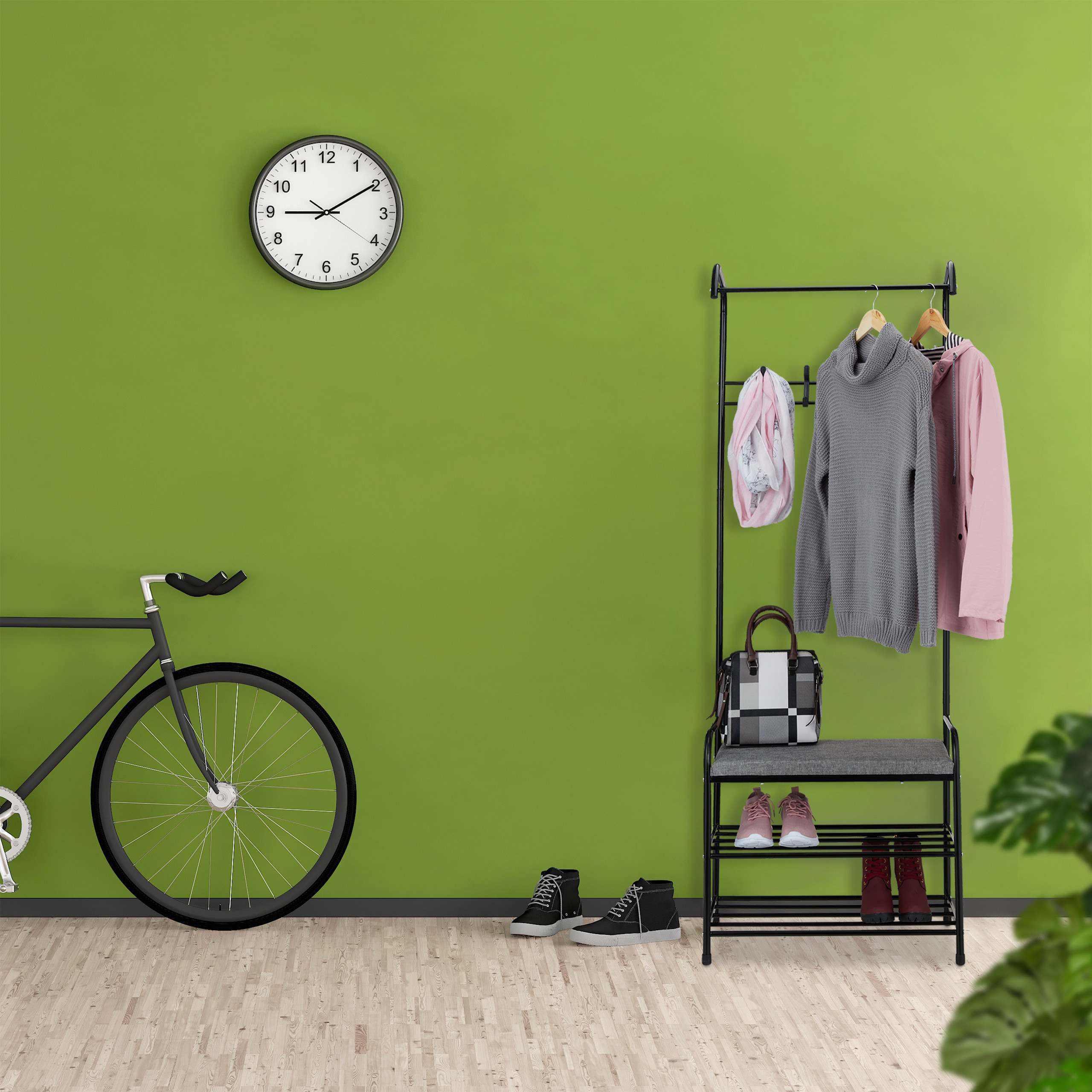 • Universalumas: Paltų stovas ir batų kabykla viename.