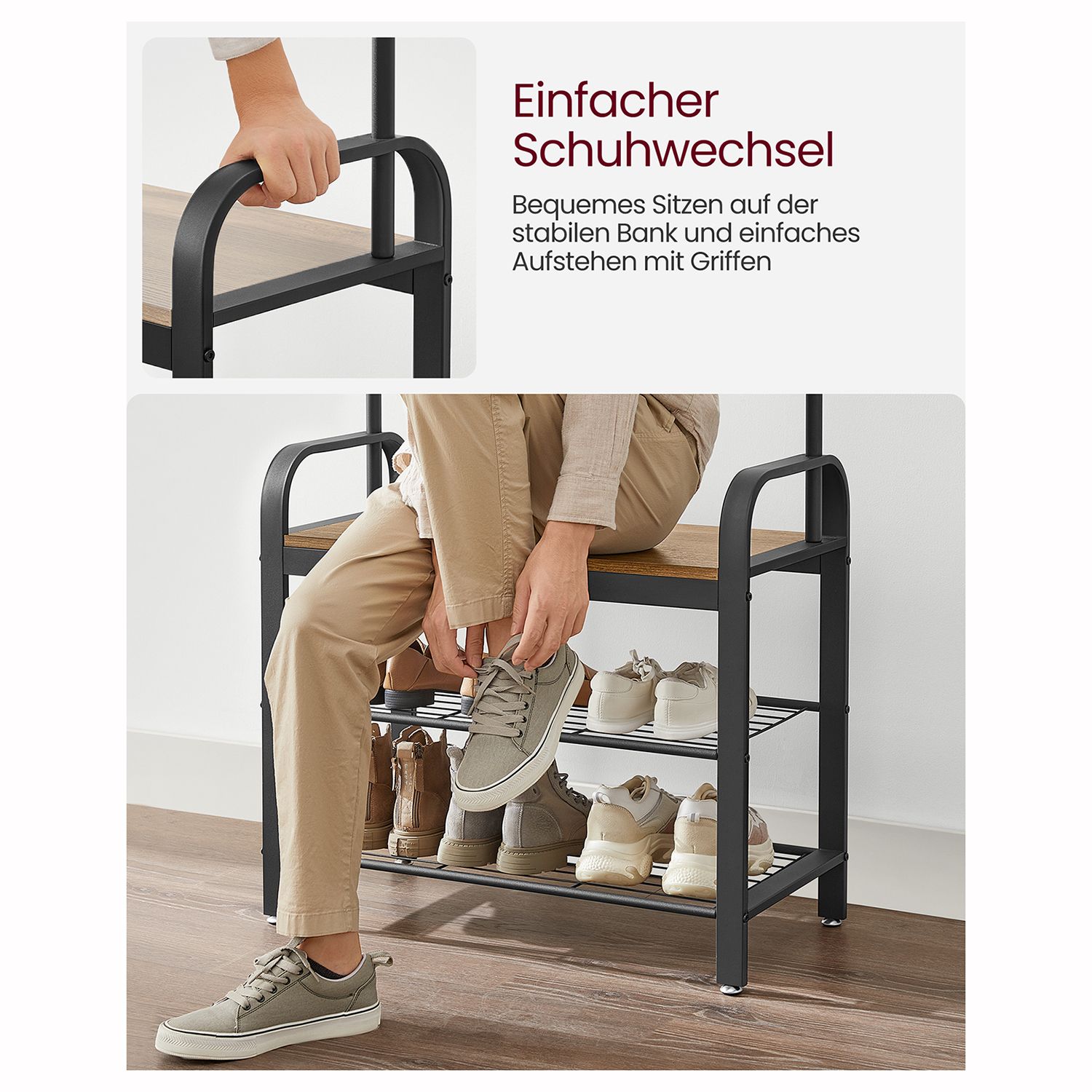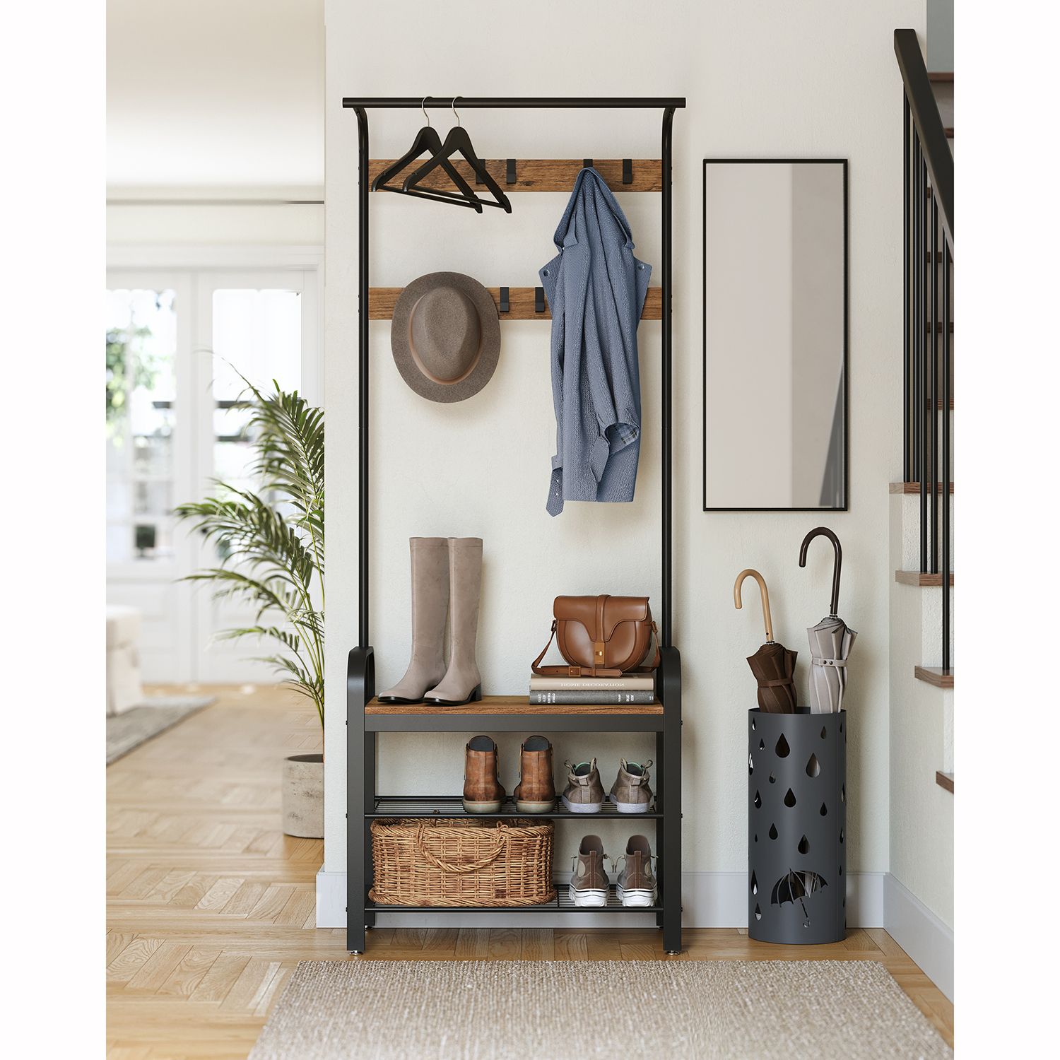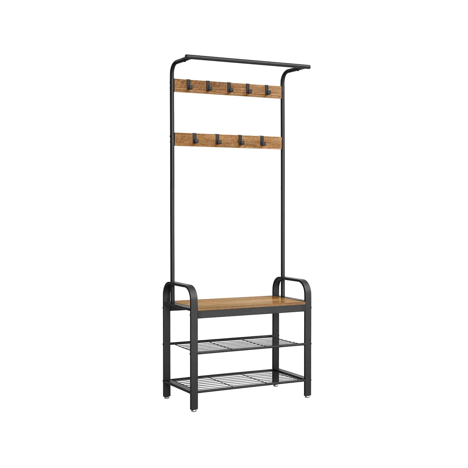 Drabužių kabykla su suoliuku HSR040B41 yra puikus sprendimas jūsų namams, suteikiantis tiek funkcionalumą, tiek stilių. Šis gaminys pasižymi elegantiška riešutmedžio ruda-juoda spalva, kuri puikiai derės prie įvairių interjerų.