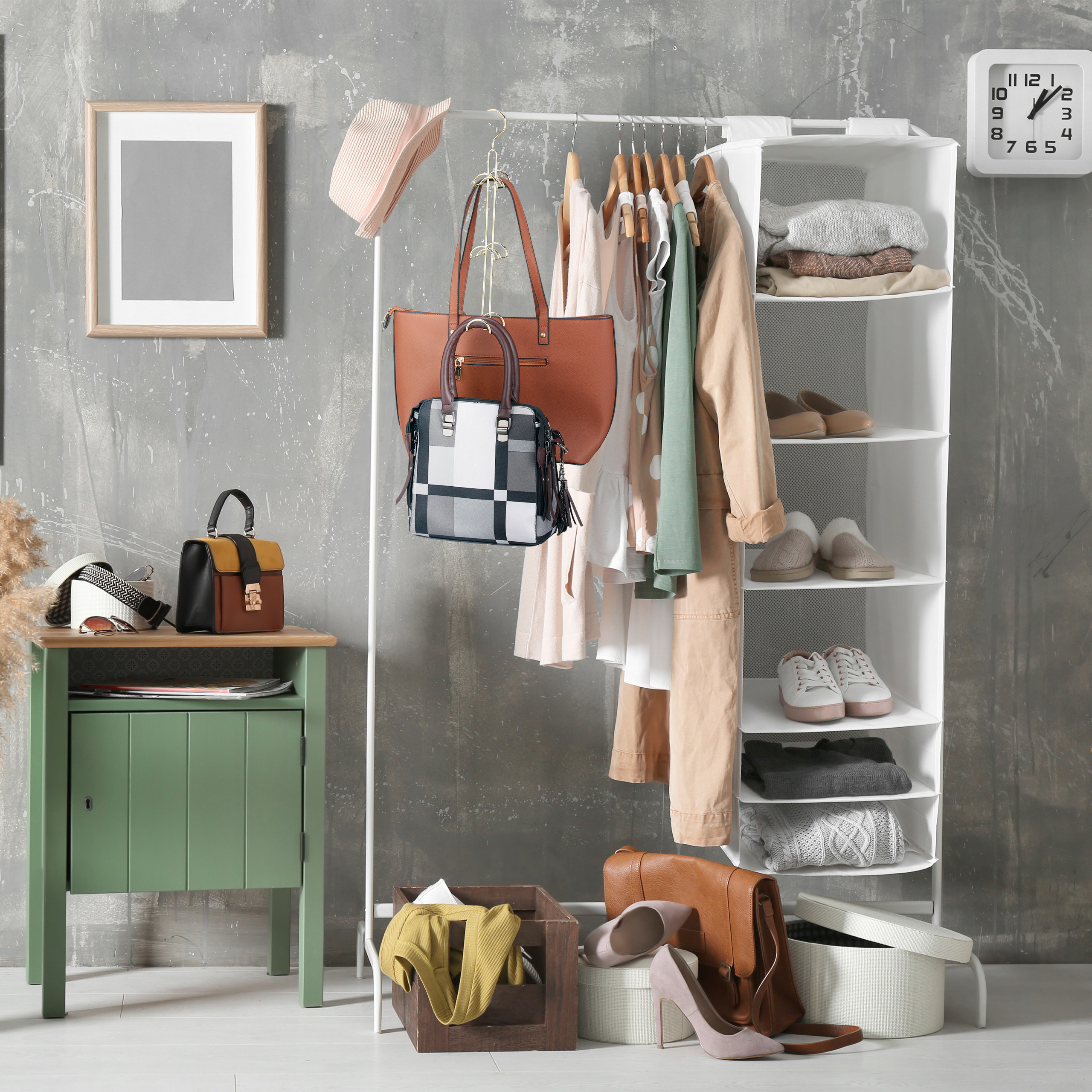 - Talpa: Vienu metu galite laikyti iki 6 rankinių, užtikrinant tvarką ir aiškumą.