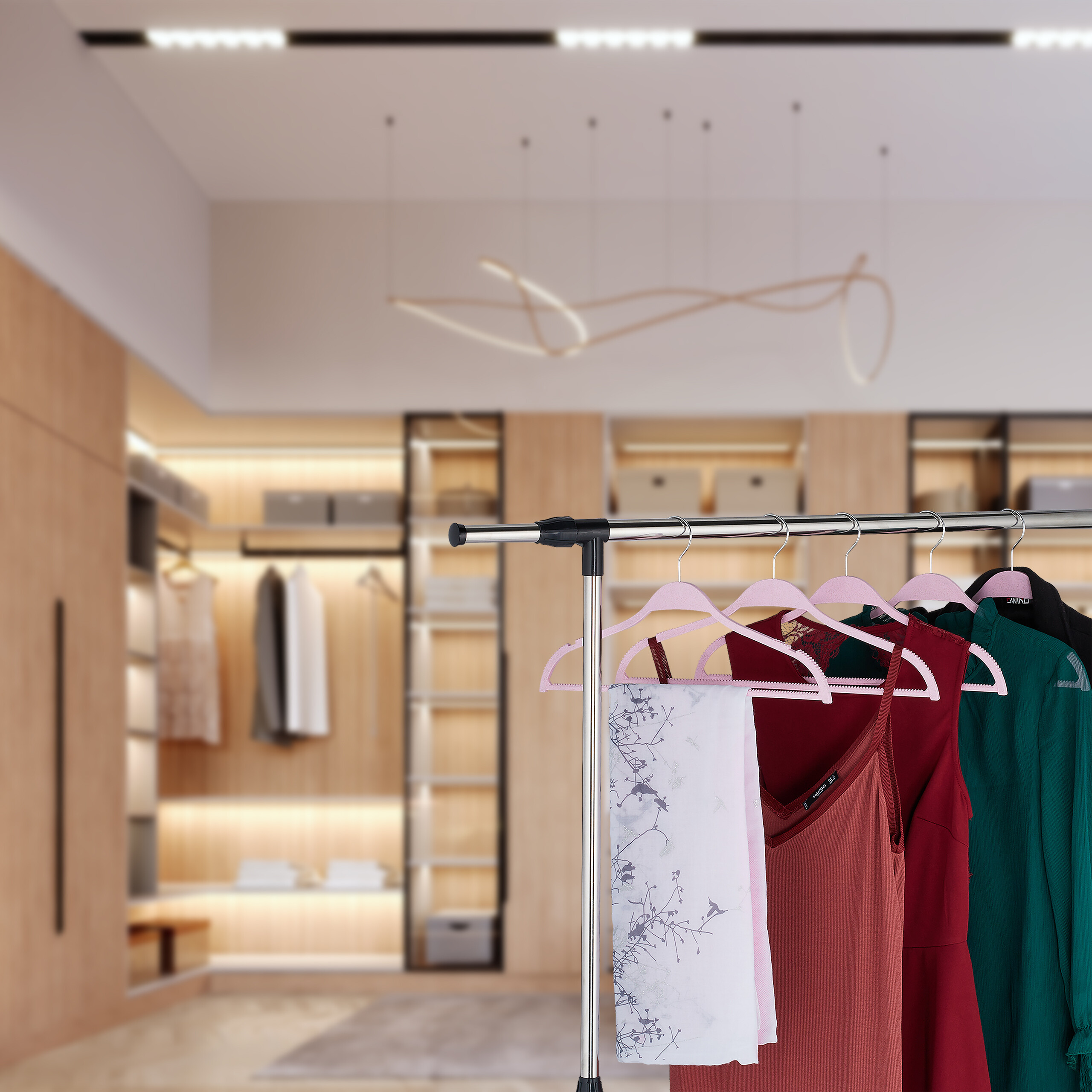 - Vietą taupantis dizainas: Dėl savo plono dizaino šios pakabos leidžia optimaliai išnaudoti erdvę Jūsų spintoje.