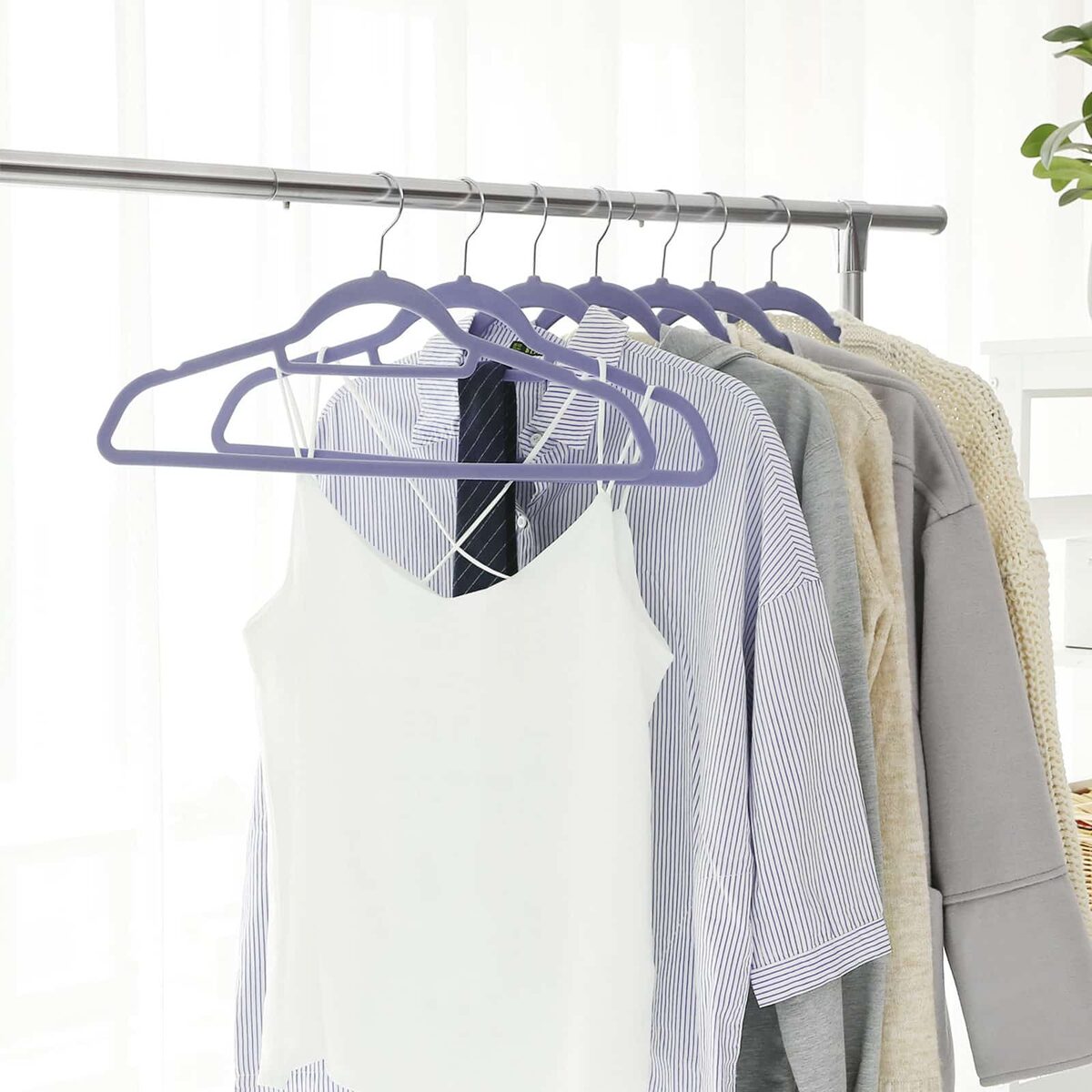 Šios aksominės pakabos, kurių storis tik 1/4 colio, užima mažiau vietos nei įprastos nendrių pakabos, todėl spintoje telpa dvigubai daugiau drabužių. Tai puikus sprendimas ribotoms spintoms!