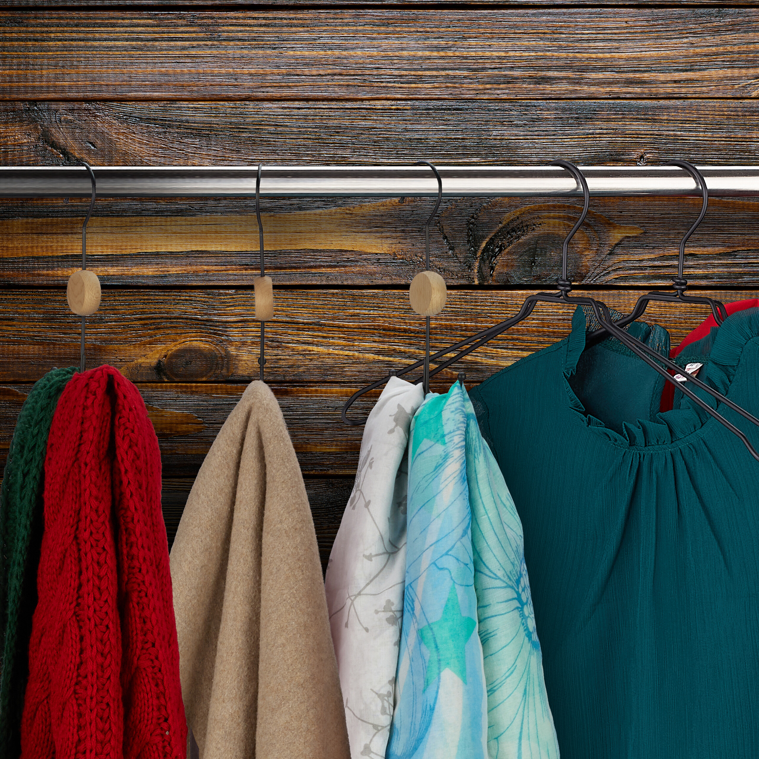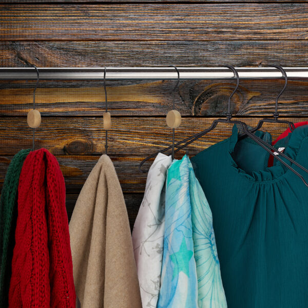 - Estetika: Dekoratyvinis medinis elementas suteikia pakaboms išskirtinį vizualinį akcentą, kuris traukia akį ir puošia jūsų drabužių kabyklą.