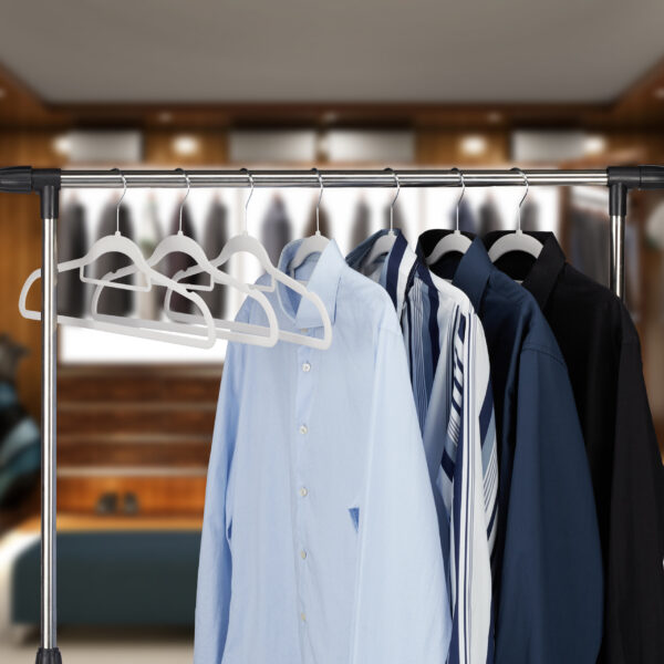 - Patikimas Laikymas: Flokuota marškinių kabykla užtikrina, kad jūsų drabužiai išliks savo vietoje ir neslys nuo pakabos.
