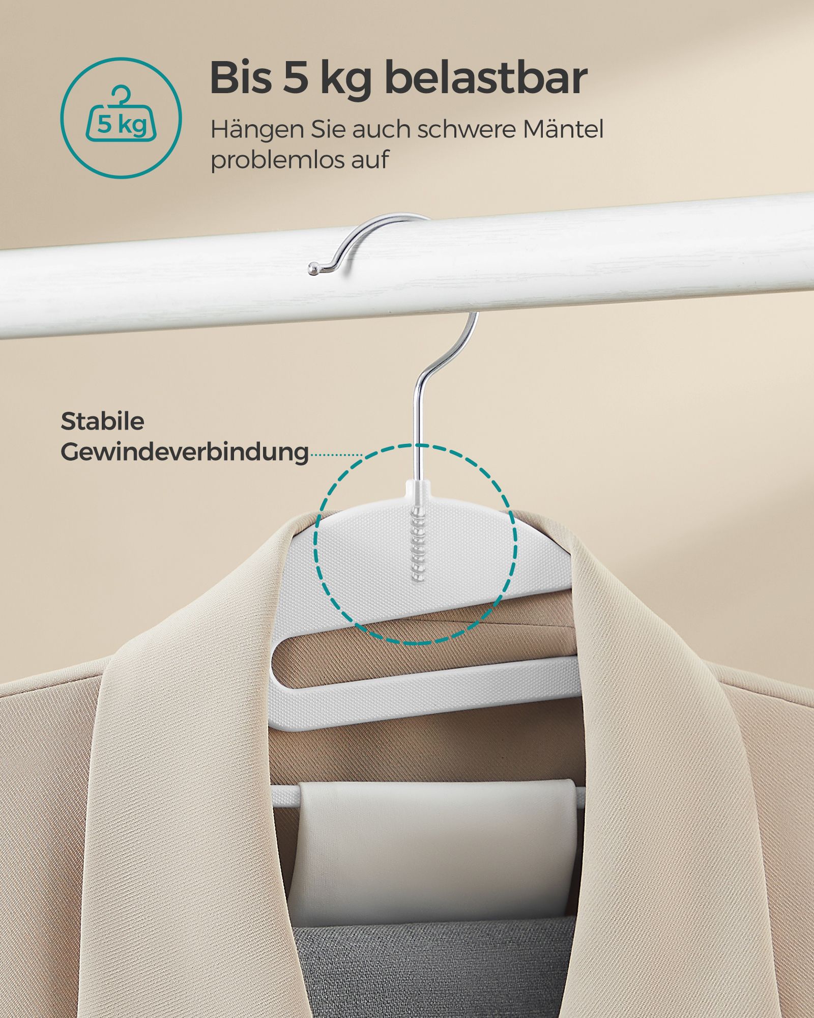 - Maksimali apkrova: Kiekviena pakaba gali atlaikyti iki 5 kg statinės apkrovos, todėl jos tinka tiek lengviems, tiek sunkesniems drabužiams.