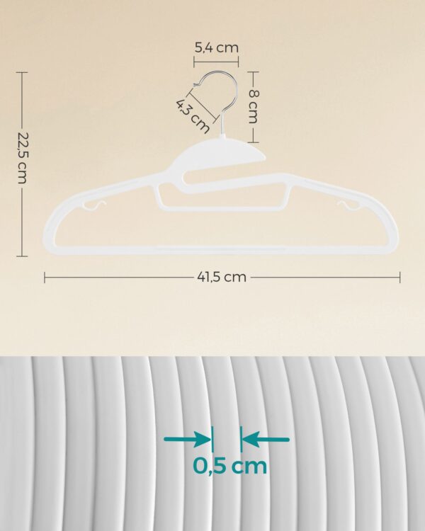 - Matmenys: Kiekvienos pakabos dydis yra 41,5 x 22,5 cm (P x A), todėl jos puikiai tinka įvairių dydžių drabužiams.