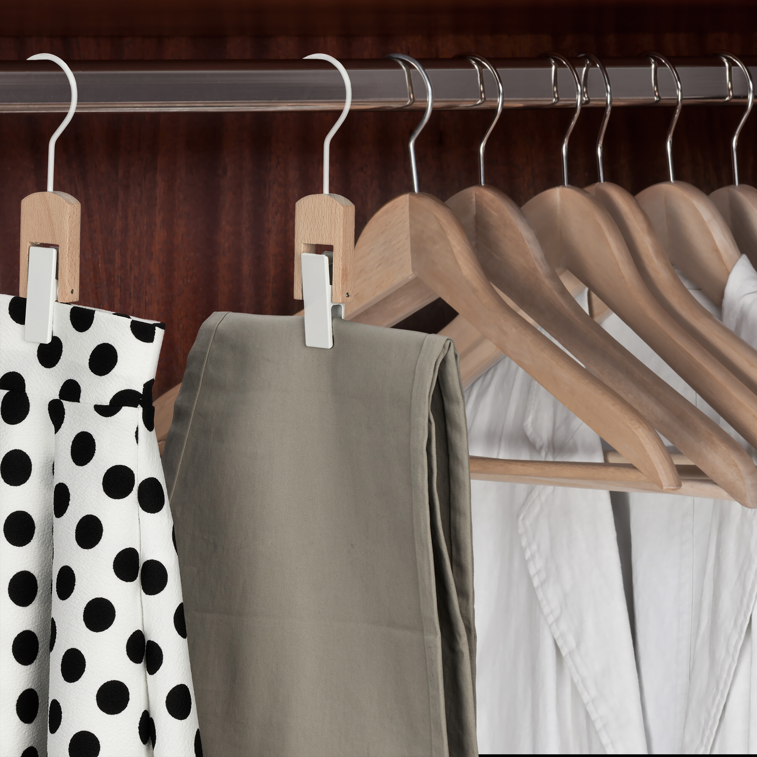Šios pakabos ne tik funkcionalios, bet ir stebina savo šiuolaikišku dizainu. Harmoningas balto metalo ir natūralaus medžio derinys tikrai traukia akį ir suteikia jūsų spintai elegancijos.