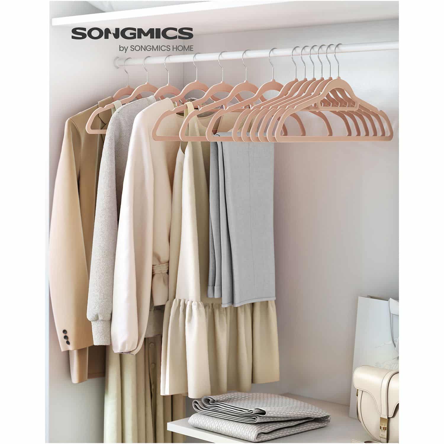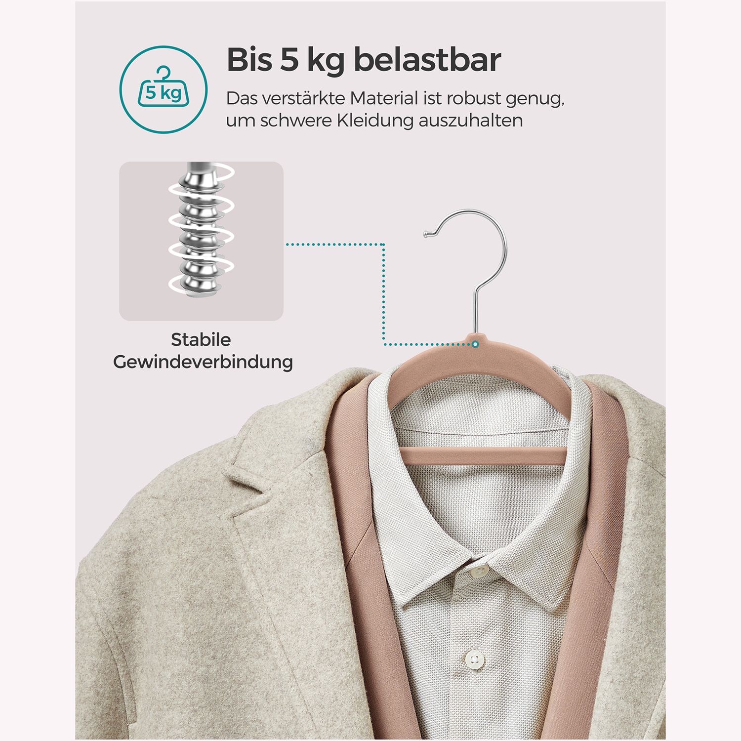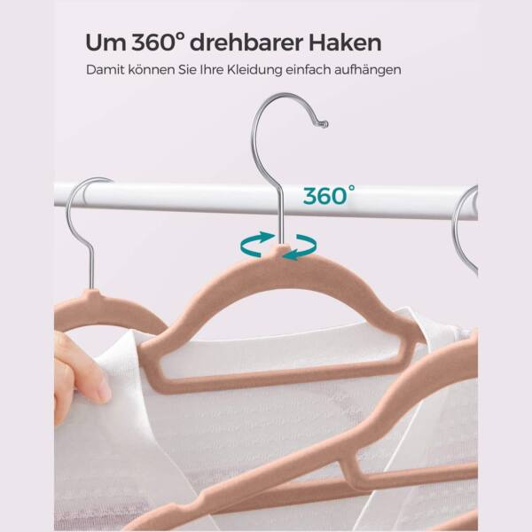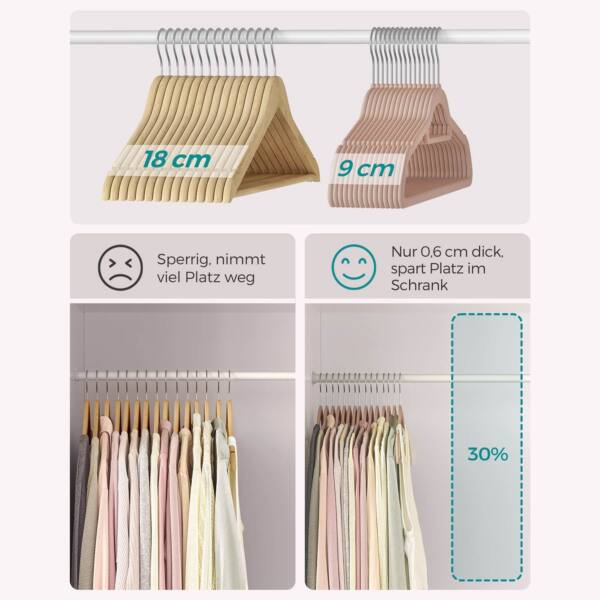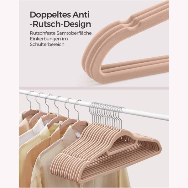 Šis drabužių pakabų rinkinys, kurį sudaro 20 vienetų, yra šviesiai rudos spalvos ir pagamintas iš aukštos kokybės velvetinės medžiagos, ABS plastiko bei metalinio kabliuko. Kiekvienos pakabos dydis yra 43,5 x 0,6 x 22,5 cm , o bendras 20 pakabų svoris siekia 1,6 kg.