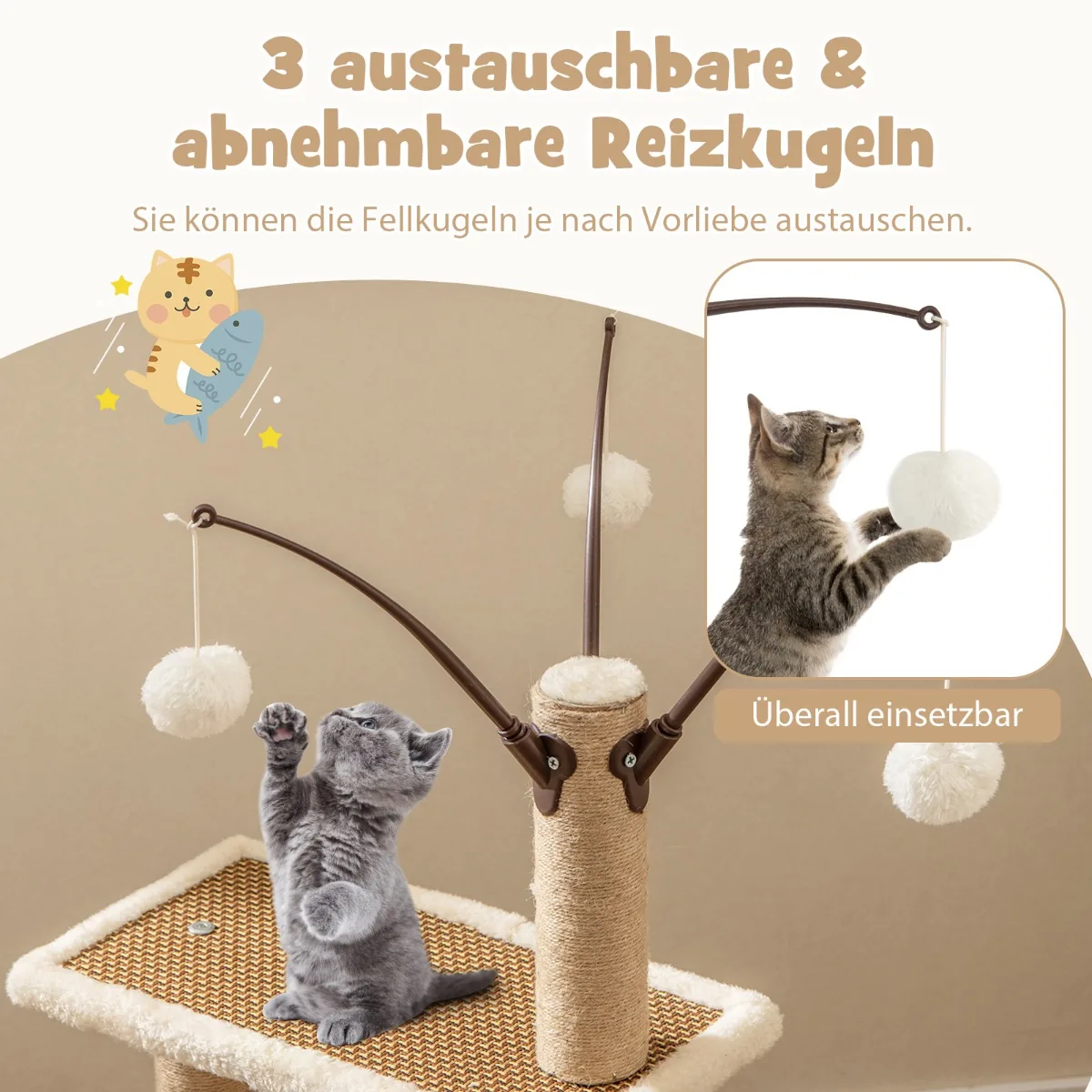 - Mažas kačių medis su trimis keičiami ir nuimami žaislai, lengvai pritaikomas skirtingoms erdvėms.