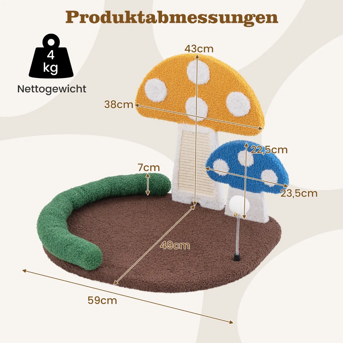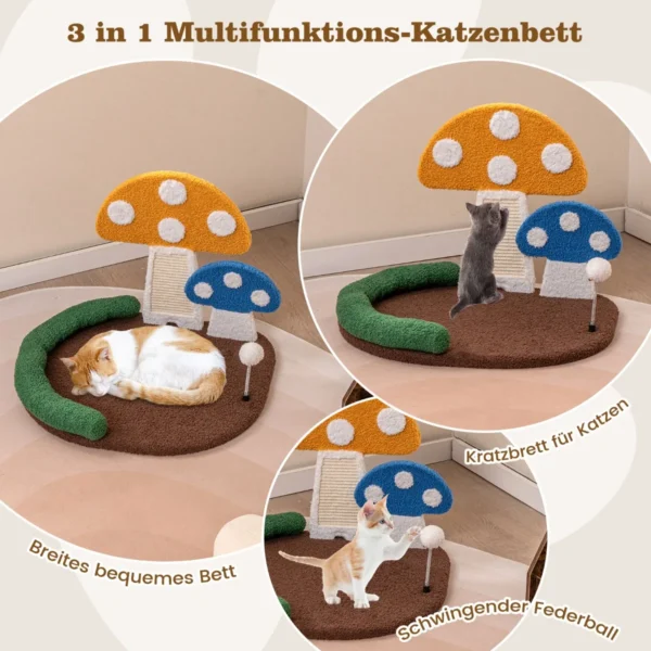 Draskyklė 59x49x43cm, įvairių spalvų – funkcionalus ir patogus kačių guolis, kuris suteiks jūsų augintiniui poilsio ir pramogų vietą. Šis grybo formos katės medis apjungia lovą, kasymo lentą ir supamą kamuolį, tinkantį įvairioms katės veikloms.
