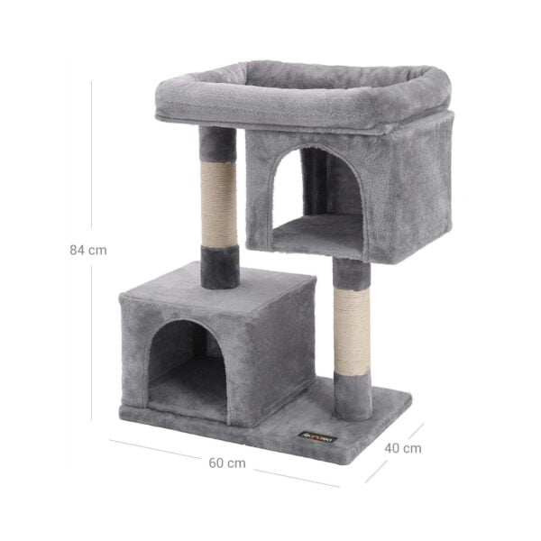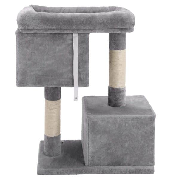 Šviesiai pilkos spalvos draskyklė, pagaminta iš CARB sertifikuotos medžio drožlių plokštė (MDP) , pliušo ir sizalio, yra puikus pasirinkimas jūsų katės pramogoms ir poilsiui.