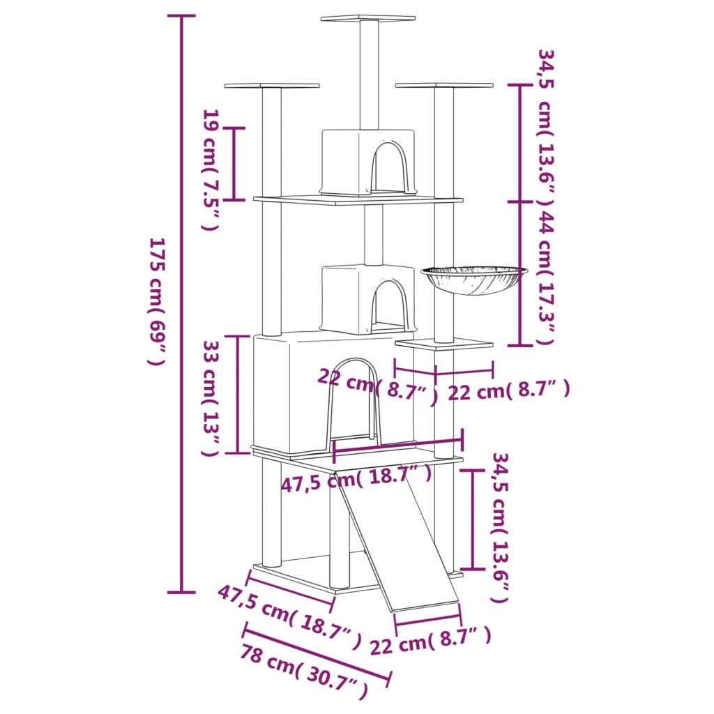 Su šia viskas viename draskykle katėms užtikrinkite, kad jūsų mylimos katės bus visuomet užimtos! Viskas viename bokštas katėms: kelių aukštų baldas katėms turi 3 namelius, 1 hamaką, 1 kopėčias ir platformas, tad jūsų katės turės puikią vietą laipioti, tupėti, draskyti, slėptis bei pailsėti.Minkšta pliušo medžiaga: itin storas ir minkštas pliušas yra gerai vėdinamas, atsparus įbrėžimams, itin patogus ir šiltas.Stovai iš natūralaus sizalio: draskyklės katėms stovai iš elastingo ir tvirto natūralaus sizalio puikiai tiks jūsų mylimoms katėms patenkinti savo instinktus draskyti, taip užtikrinant, kad jos nedraskys jūsų baldų. Pastaba:Siekiant užtikrinti lengvą surinkimą, kiekvienas gaminys pristatomas su surinkimo instrukcijomis dėžėje.