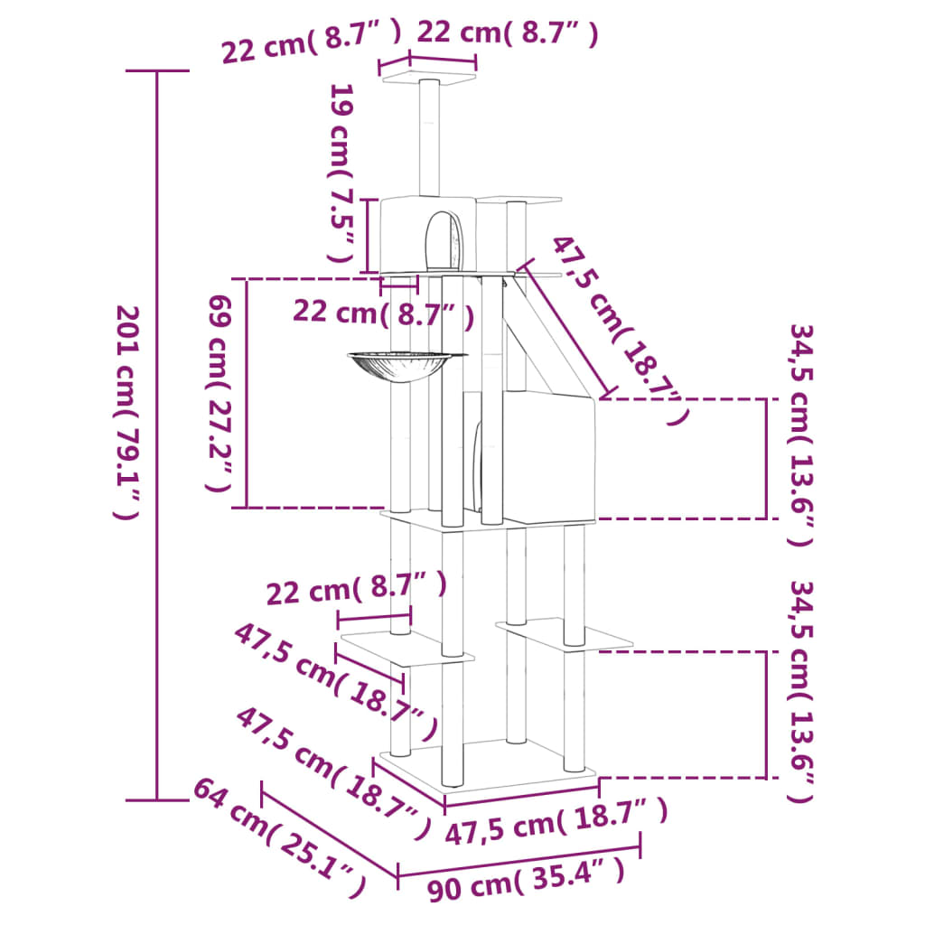 Su šia draskykle katėms jūsų pūkuoti draugai pajus prabangos skonį! Jūsų katėms patiks ją draskyti, ant jos laipioti, tupėti, slėptis ir ilsėtis. Viskas-viename bokštas katėms: kelių aukštų draskymo bokštas katėms suteiks jūsų katei džiaugsmo bei užtikrins kompaktišką vietą žaisti, mankštintis ir šiltą namelį jaukiam poguliui. Jis turi kopėčias, krepšį, 2 namelius ir platformas.Patogus pliušas: odos nedirginantis ir pūkuotas pliušo uždangalas leis jūsų keturkojams draugams patogiai žaisti.Patvari sizalio virvė: šio kačių veiklos centro stovai yra apvynioti natūralaus sizalio virvėmis, kurios užtikrina, kad katės galės sveikai draskyti. Pastaba:Siekiant užtikrinti lengvą surinkimą, kiekvienas gaminys pristatomas su surinkimo instrukcijomis dėžėje.