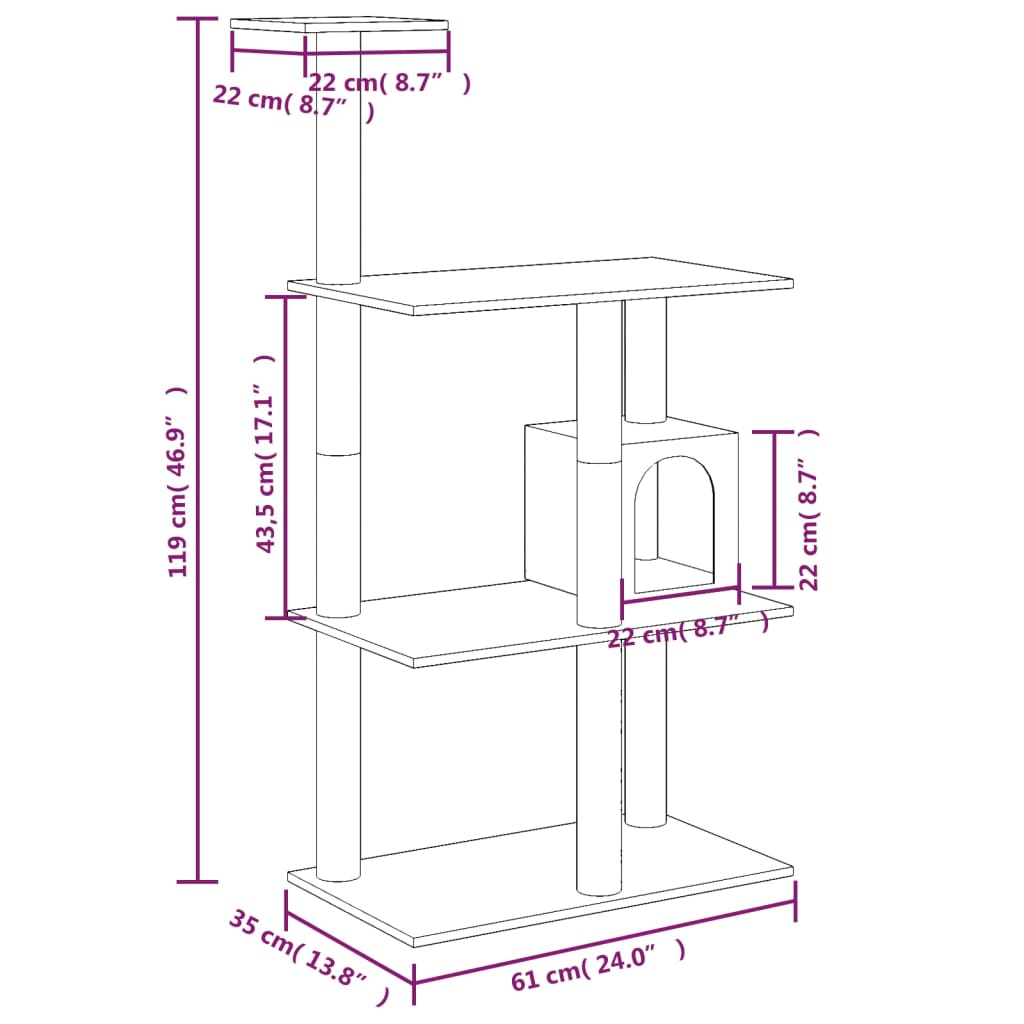 Su šia draskykle katėms jūsų pūkuoti draugai pajus prabangos skonį! Jūsų katėms patiks ją draskyti, ant jos laipioti, tupėti, slėptis ir ilsėtis. Viskas-viename bokštas katėms: kelių aukštų draskymo bokštas katėms suteiks jūsų katei džiaugsmo bei užtikrins kompaktišką vietą žaisti, mankštintis ir šiltą namelį jaukiam poguliui. Ji turi namelį ir platformas.Patogus pliušas: odos nedirginantis ir pūkuotas pliušo uždangalas leis jūsų keturkojams draugams patogiai žaisti.Patvari sizalio virvė: šio kačių veiklos centro stovai yra apvynioti natūralaus sizalio virvėmis, kurios užtikrina, kad katės galės sveikai draskyti. Pastaba:Siekiant užtikrinti lengvą surinkimą, kiekvienas gaminys pristatomas su surinkimo instrukcijomis dėžėje.