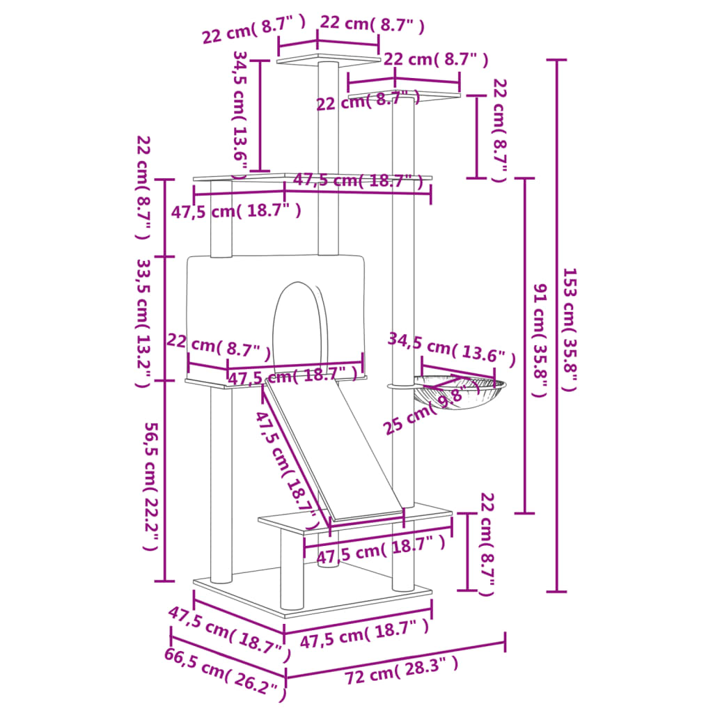 Su šia viskas viename draskykle katėms užtikrinkite, kad jūsų mylimos katės bus visuomet užimtos! Viskas viename bokštas katėms: kelių aukštų baldas katėms turi namelį, krepšį, kopėčias ir platformas, tad jūsų katės turės puikią vietą laipioti, tupėti, draskyti, slėptis bei pailsėti.Minkšta pliušo medžiaga: itin storas ir minkštas pliušas yra gerai vėdinamas, atsparus įbrėžimams, itin patogus ir šiltas.Stovai iš natūralaus sizalio: draskyklės katėms stovai iš elastingo ir tvirto natūralaus sizalio puikiai tiks jūsų mylimoms katėms patenkinti savo instinktus draskyti, taip užtikrinant, kad jos nedraskys jūsų baldų.