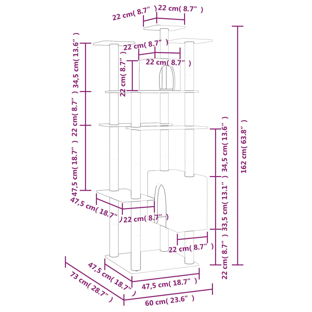 Su šia draskykle katėms jūsų pūkuoti draugai pajus prabangos skonį! Jūsų katėms patiks ją draskyti, ant jos laipioti, tupėti, slėptis ir ilsėtis. Viskas-viename bokštas katėms: kelių aukštų draskymo bokštas katėms suteiks jūsų katei džiaugsmo bei užtikrins kompaktišką vietą žaisti, mankštintis ir šiltą namelį jaukiam poguliui. Ji turi 2 namelius ir platformas.Patogus pliušas: odos nedirginantis ir pūkuotas pliušo uždangalas leis jūsų keturkojams draugams patogiai žaisti.Patvari sizalio virvė: šio kačių veiklos centro stovai yra apvynioti natūralaus sizalio virvėmis, kurios užtikrina, kad katės galės sveikai draskyti. Pastaba:Siekiant užtikrinti lengvą surinkimą, kiekvienas gaminys pristatomas su surinkimo instrukcijomis dėžėje.