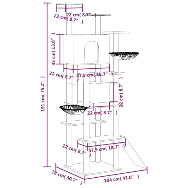 Su šia draskykle katėms jūsų pūkuoti draugai pajus prabangos skonį! Jūsų katėms patiks ją draskyti, ant jos laipioti, tupėti, slėptis ir ilsėtis. Viskas-viename bokštas katėms: kelių aukštų draskymo bokštas katėms suteiks jūsų katei džiaugsmo bei užtikrins kompaktišką vietą žaisti, mankštintis ir šiltą namelį jaukiam poguliui. Jis turi kopėčias, 2 namelius, 2 krepšius ir platformas.Patogus pliušas: odos nedirginantis ir pūkuotas pliušo uždangalas leis jūsų keturkojams draugams patogiai žaisti.Patvari sizalio virvė: šio kačių veiklos centro stovai yra apvynioti natūralaus sizalio virvėmis, kurios užtikrina, kad katės galės sveikai draskyti. Pastaba:Siekiant užtikrinti lengvą surinkimą, kiekvienas gaminys pristatomas su surinkimo instrukcijomis dėžėje.