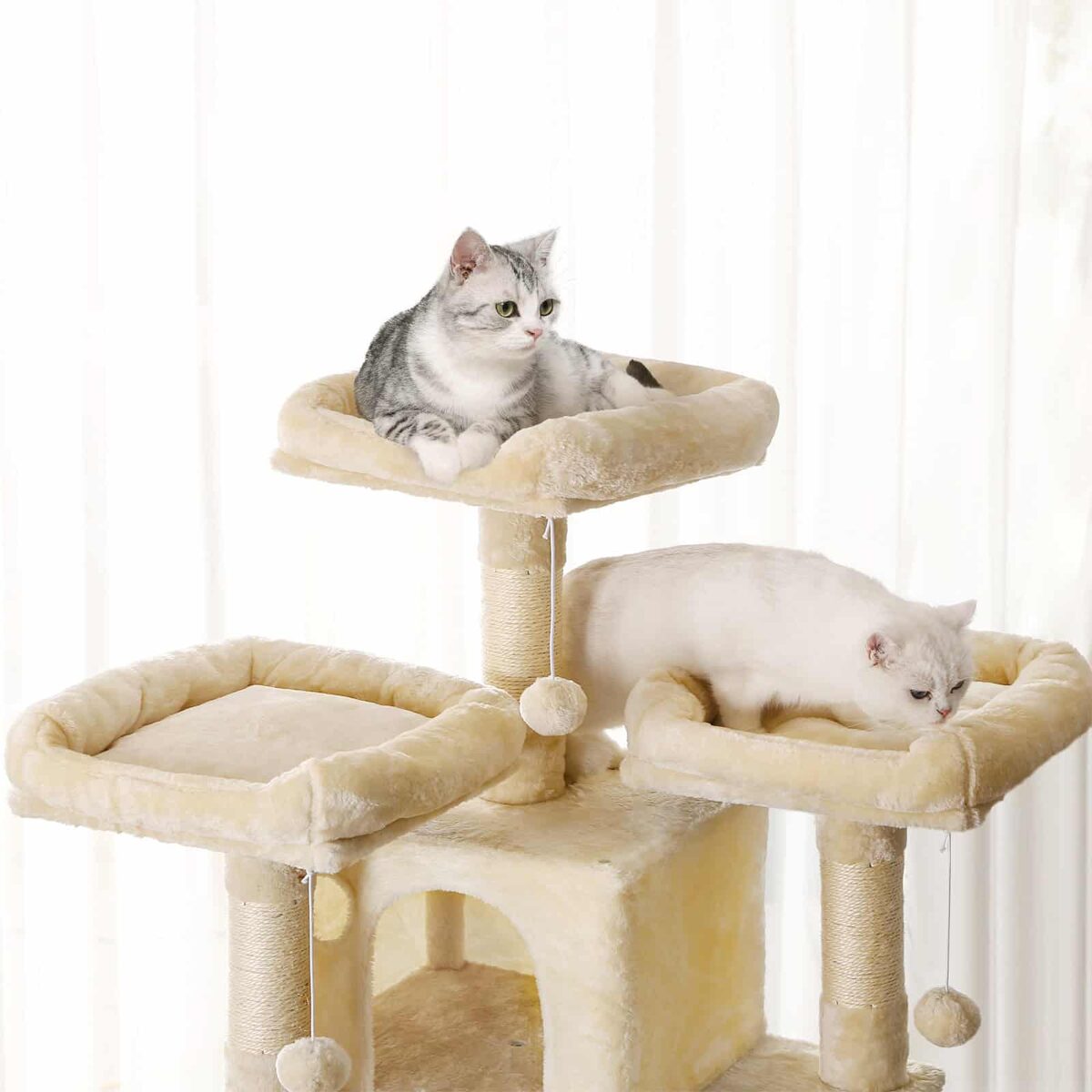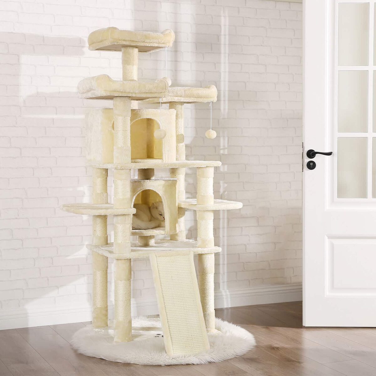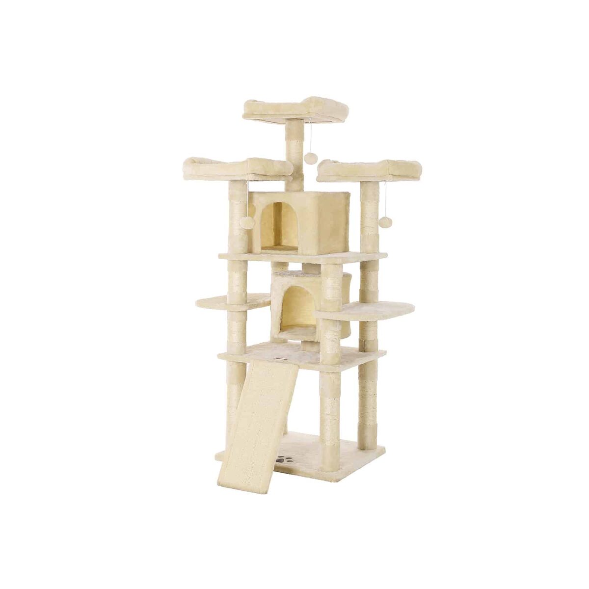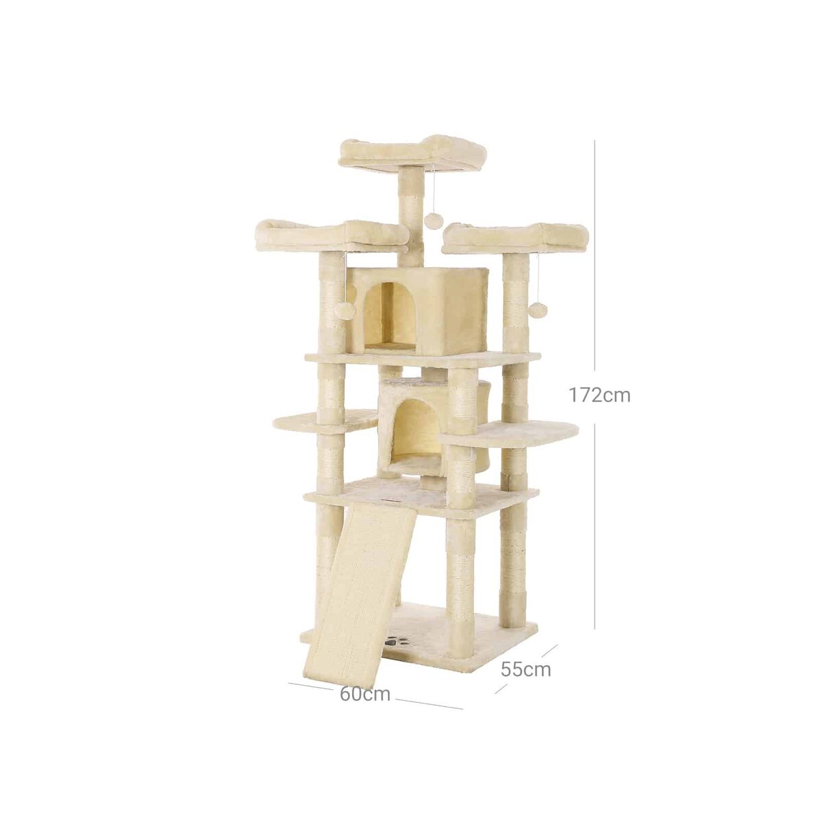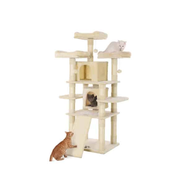 Daug privalumų turintis draskyklės namelis 172 cm, smėlio spalvos, išlaikė kačiuko testą. Mums ypač patiko du dideli jaukūs urvai ir trys pūkuotos apžvalgos aikštelės. Tačiau draskymo lenta apatinėje katės žaislo dalyje taip pat buvo labai paklausi. Be to, du bandytojai jautėsi saugūs ir be baimės šokinėjo iš platformos į platformą.
