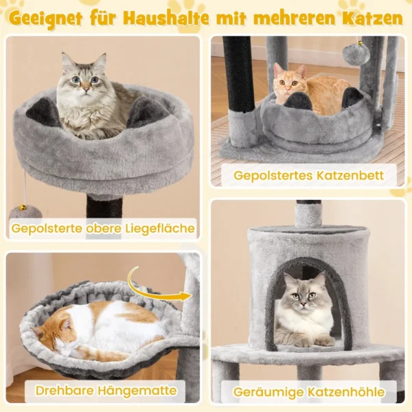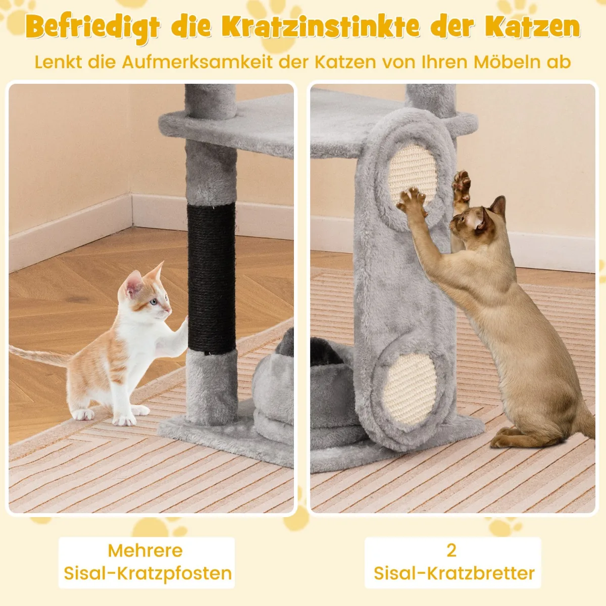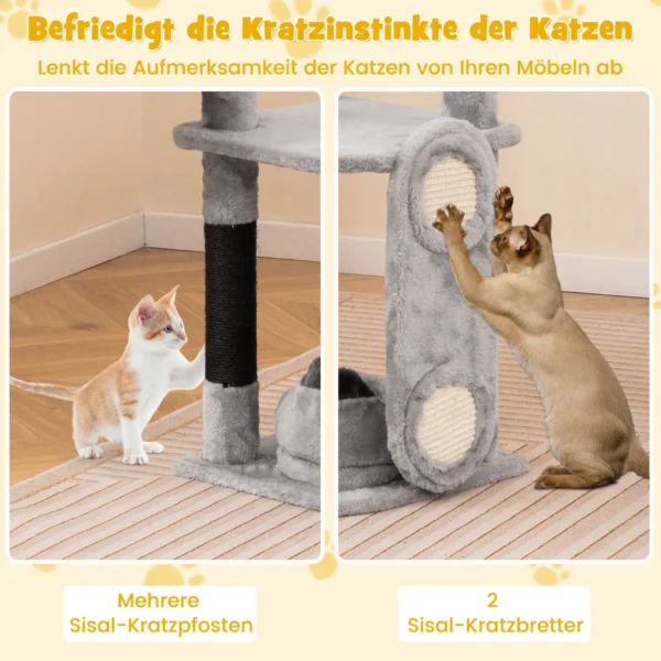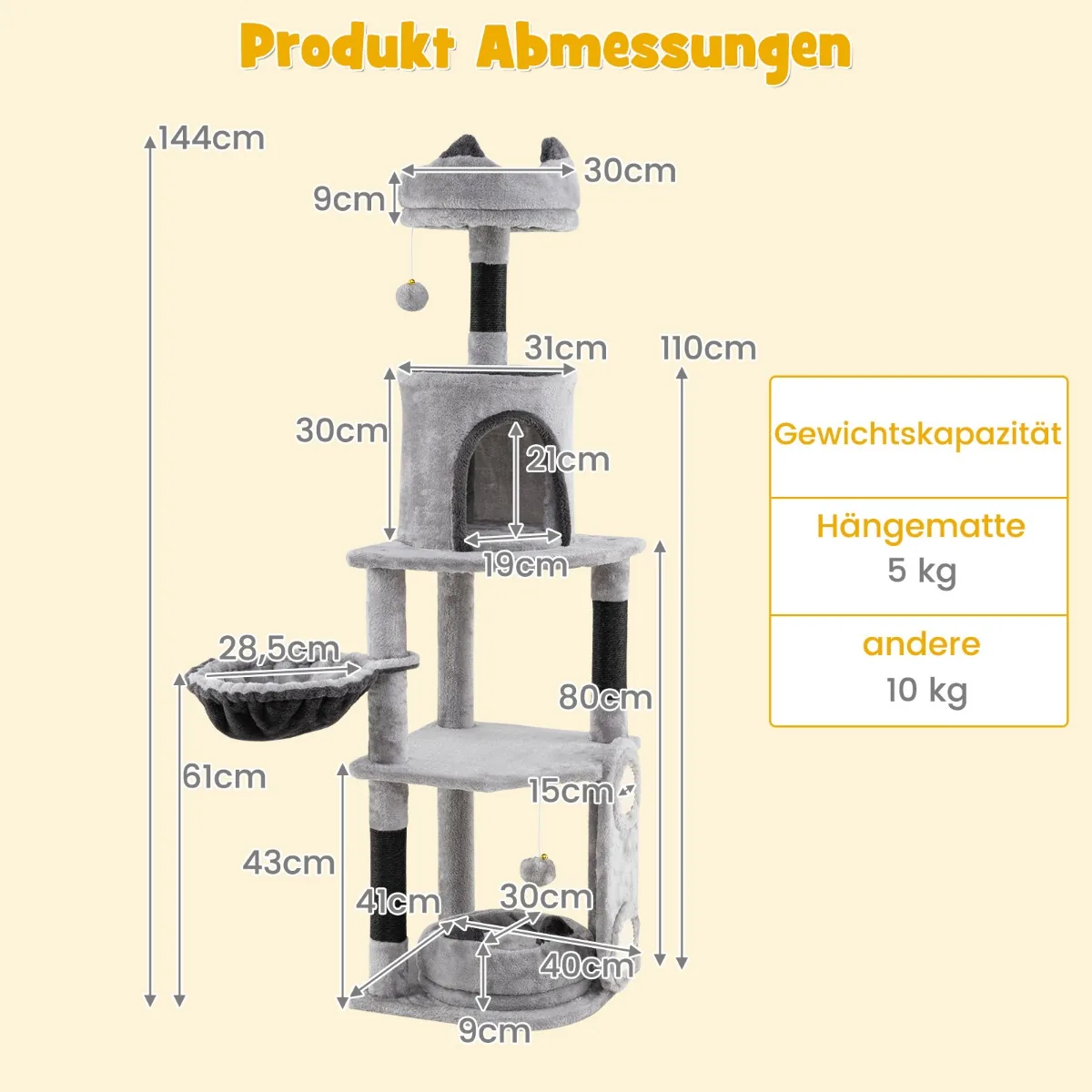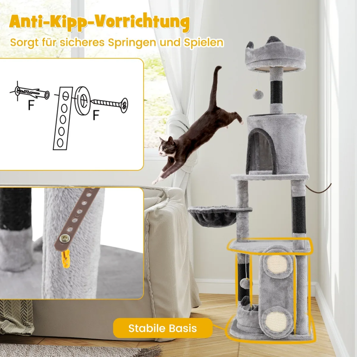 Draskyklė namelis 41x40x144cm, pilkos/juodos spalvos – daugiapakopis kačių medis, sukurtas užtikrinti jūsų katės komfortą ir pramogas. Šis praktiškas kačių baldas apima erdvų namelį, paminkštintą platformą, hamaką bei kasymosi stulpelius, kurie patenkins natūralų kačių instinktą.