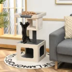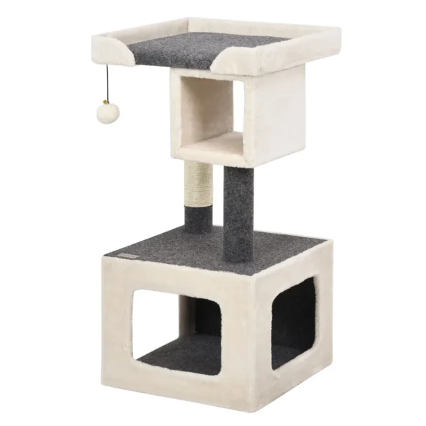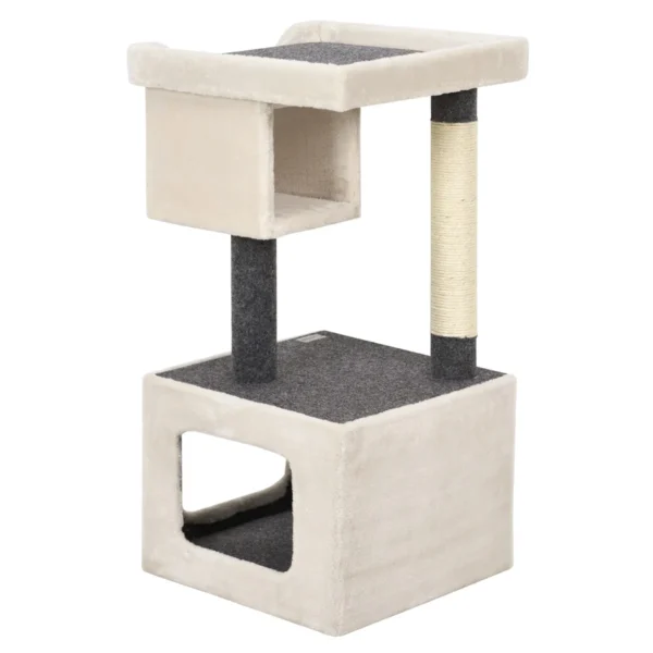Draskyklė namelis 42x42x80cm, baltos ir tamsiai pilkos spalvos, yra praktiškas sprendimas jūsų katei žaisti ir ilsėtis. Tvarkingai suplanuota dviejų lygių konstrukcija su natūralaus sizalio stulpeliais leidžia katei laipioti, pagaląsti nagus ir stebėti aplinką.