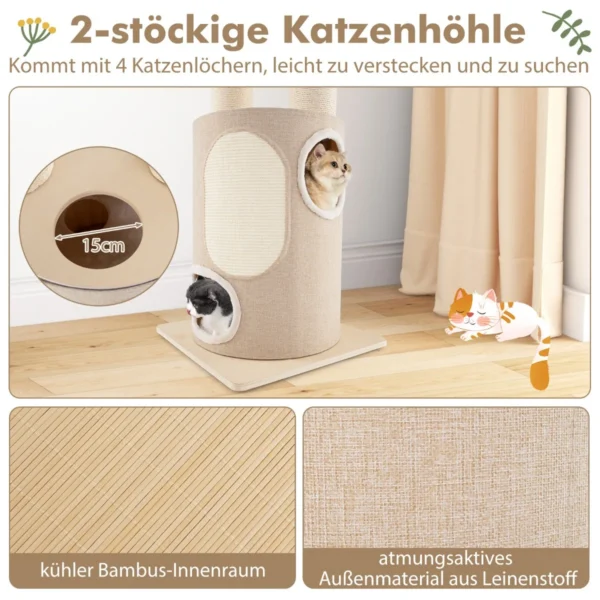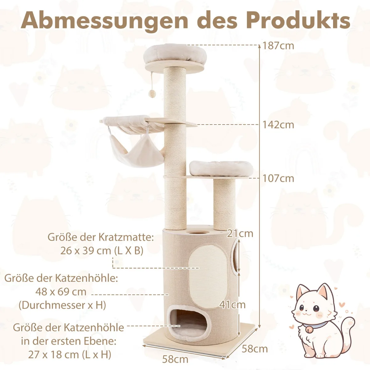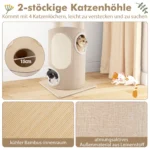 Draskyklė namelis 58x58x187cm, smėlio spalvos, – tai medinis kačių medis, suteikiantis erdvę žaidimui, poilsiui ir nagų galandimui. Aukštas ir stabilus karkasas su sizalio stulpeliais bei platformomis atitinka katės natūralius poreikius.