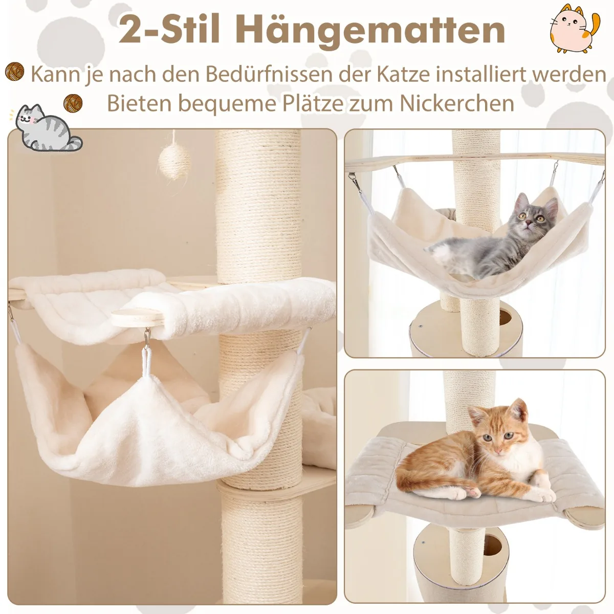- Sizalio stulpeliai, draskymo kilimėlis ir kabančios žaislinės detalės nagų galandimui bei žaidimui.
