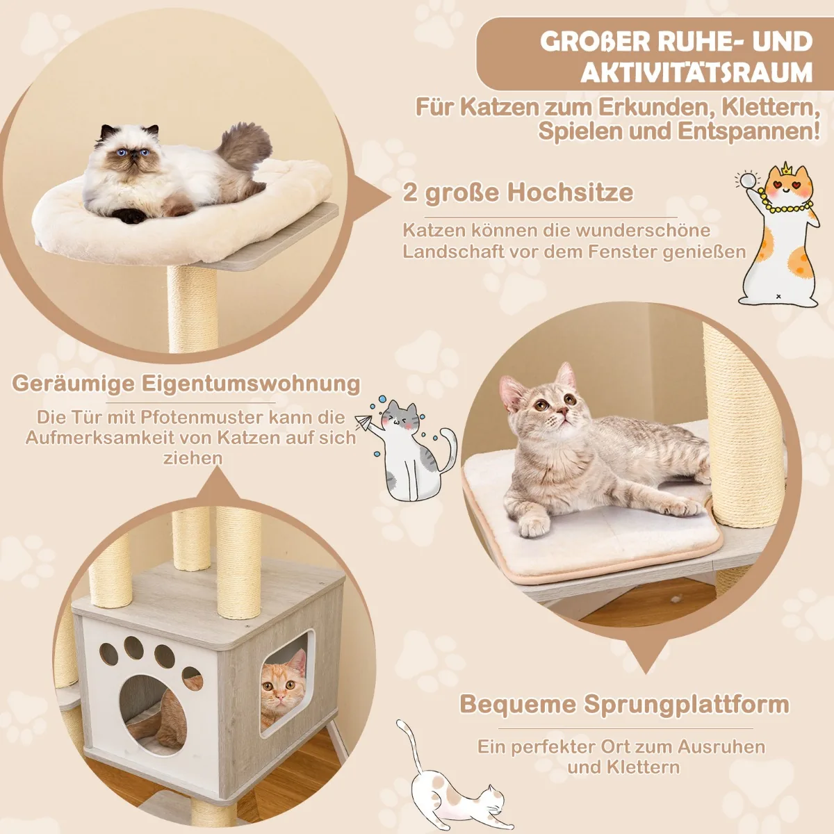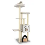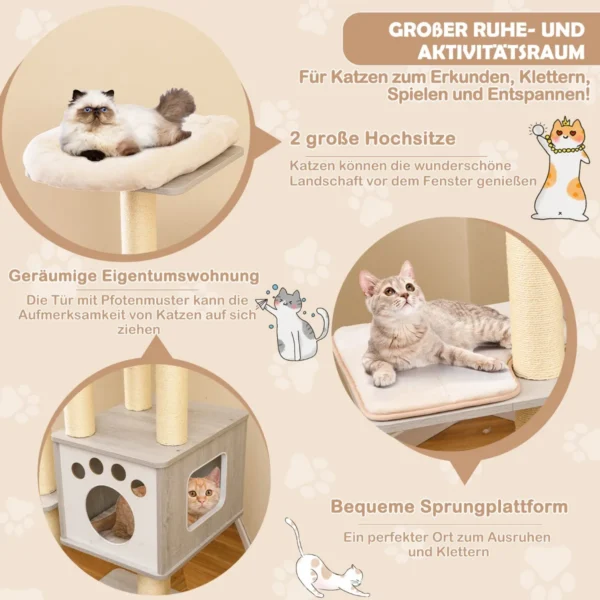 Draskyklė namelis 59x59x176 cm, smėlio/pilkos spalvos, yra universali veiklos zona jūsų katėms. Šis daugiaaukštis kačių medis leidžia katėms laipioti, ilsėtis ir mankštintis, saugant namų baldus nuo įbrėžimų. Dėl stabilios konstrukcijos ir patogių pliušinių pagalvėlių jis tinkamas įvairaus dydžio katėms.