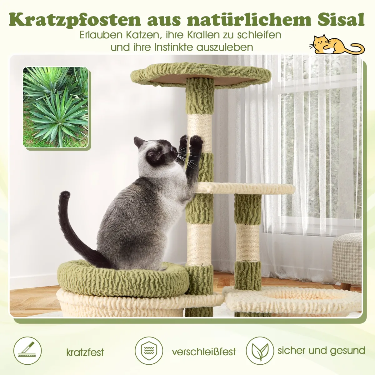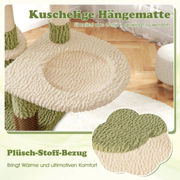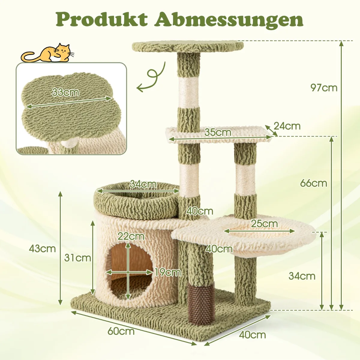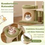 Draskyklė namelis 60x40x97cm, žalios ir kreminės spalvos, skirta katėms aktyviam laisvalaikiui ir poilsiui. Šis kelių lygių kačių medis su kasymo stulpeliais, minkštu guoliu ir hamaku užtikrina komfortą bei skatina natūralius kasymosi įpročius.