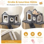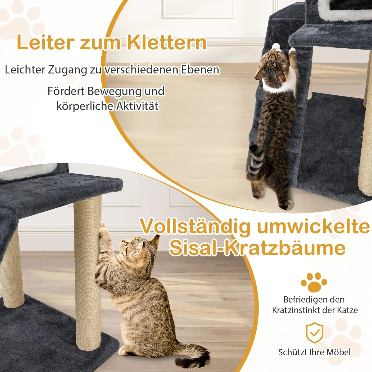 Draskyklė namelis 60x46x90cm tamsiai pilkos ir smėlio spalvos suteikia jūsų katei puikią žaidimo ir poilsio erdvę. Šis kačių medis su trimis lygiais, nameliu ir sizalio stulpeliais skatina natūralius kasymosi įpročius bei fizinį aktyvumą.