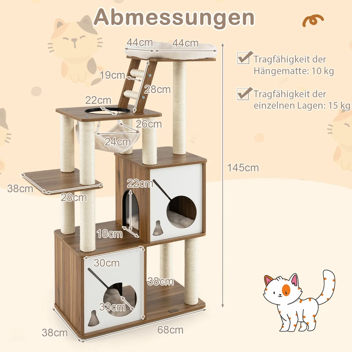 Draskyklė namelis 68x38x145cm., rudos/smėlio spalvos yra funkcionali kačių medžio konstrukcija, skirta patenkinti natūralius kačių žaidimo ir poilsio poreikius. Pagaminta iš saugių naminiams gyvūnėliams medžiagų, ši draskyklė suteikia erdvę lipimui, braižymui ir stebėjimui.