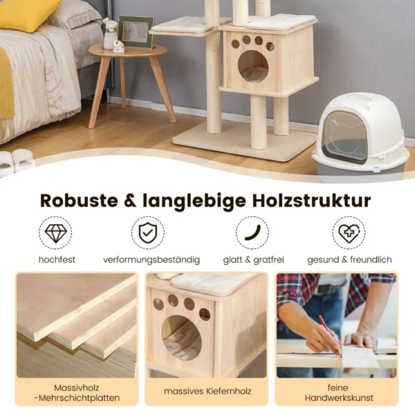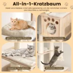 Draskyklė namelis 70x50x170cm, smėlio spalvos – tai funkcionalus ir patvarus kačių medis, skirtas aktyviam žaidimui bei poilsiui. Pagaminta iš daugiasluoksnio medžio masyvo, mediena derinama su sizalio virvėmis, suteikiančiomis idealią galimybę jūsų katėms nusitrypti nagus. Šis kačių medis pasižymi stabilumu ir patogia konstrukcija.