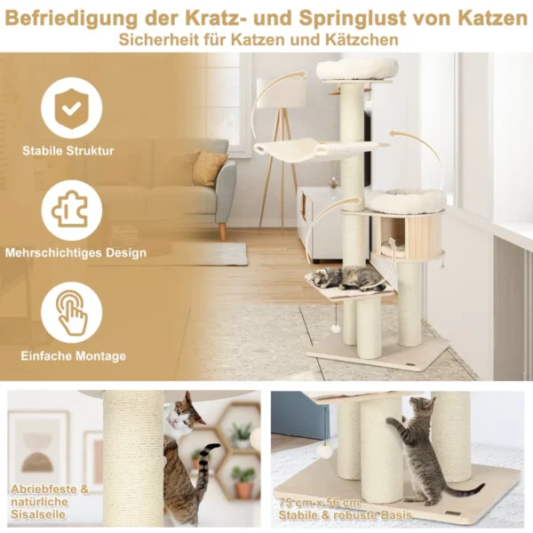 Draskyklė namelis 75x56x174cm, smėlio/šviesiai rudos spalvos, yra keturių aukštų kačių bokštas, sukurtas patenkinti natūralius katės instinktus. Tai universalus laipiojimo, draskymo ir poilsio centras, kuris padeda palaikyti katės gerovę ir saugumą namuose.