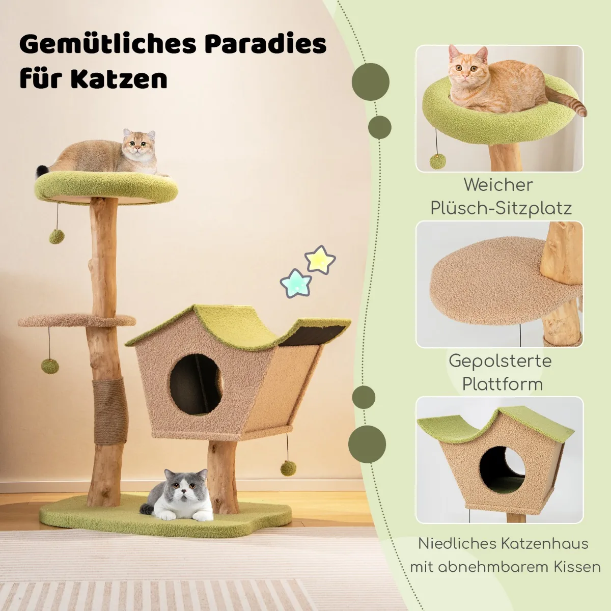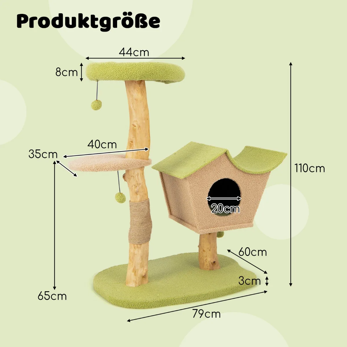 Draskyklė namelis 79x60x110cm, šviesiai rudos ir žalios spalvos, skirta katėms žaisti, laipioti ir ilsėtis. Šis kačių medis padeda išlaikyti nagų būklę bei suteikia erdvę natūraliems instinktams tenkinti.