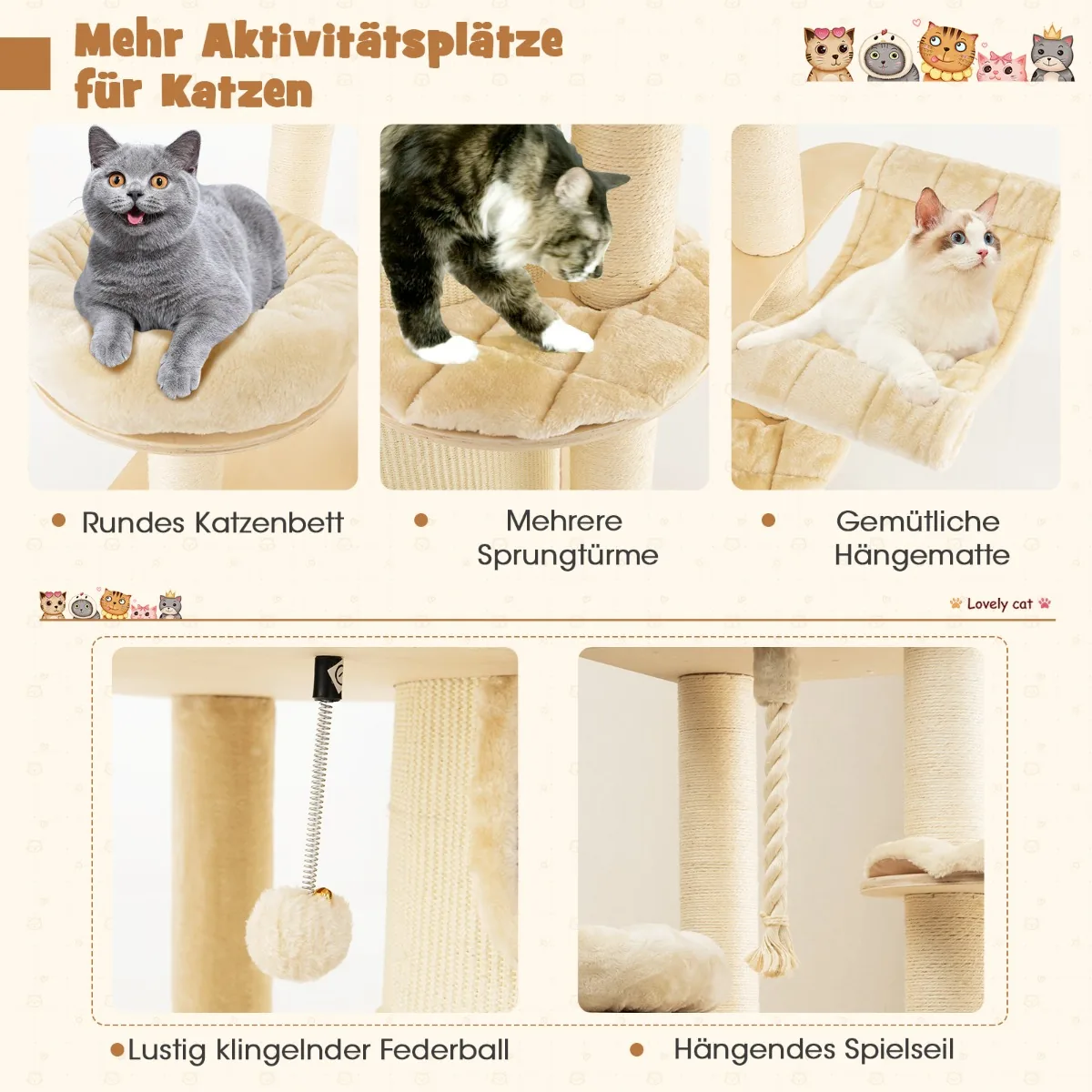 Draskyklė namelis 95x68x173cm, smėlio spalvos, suteikia katėms daugybę pramogų ir poilsio vietų. Daugiasluoksnės medžio masyvo konstrukcija, sizalis ir pliušas užtikrina ilgaamžiškumą bei komfortą. Šis kačių medis puikiai tinka įvairaus amžiaus katėms kasytis, leisti laiką ir ilsėtis.