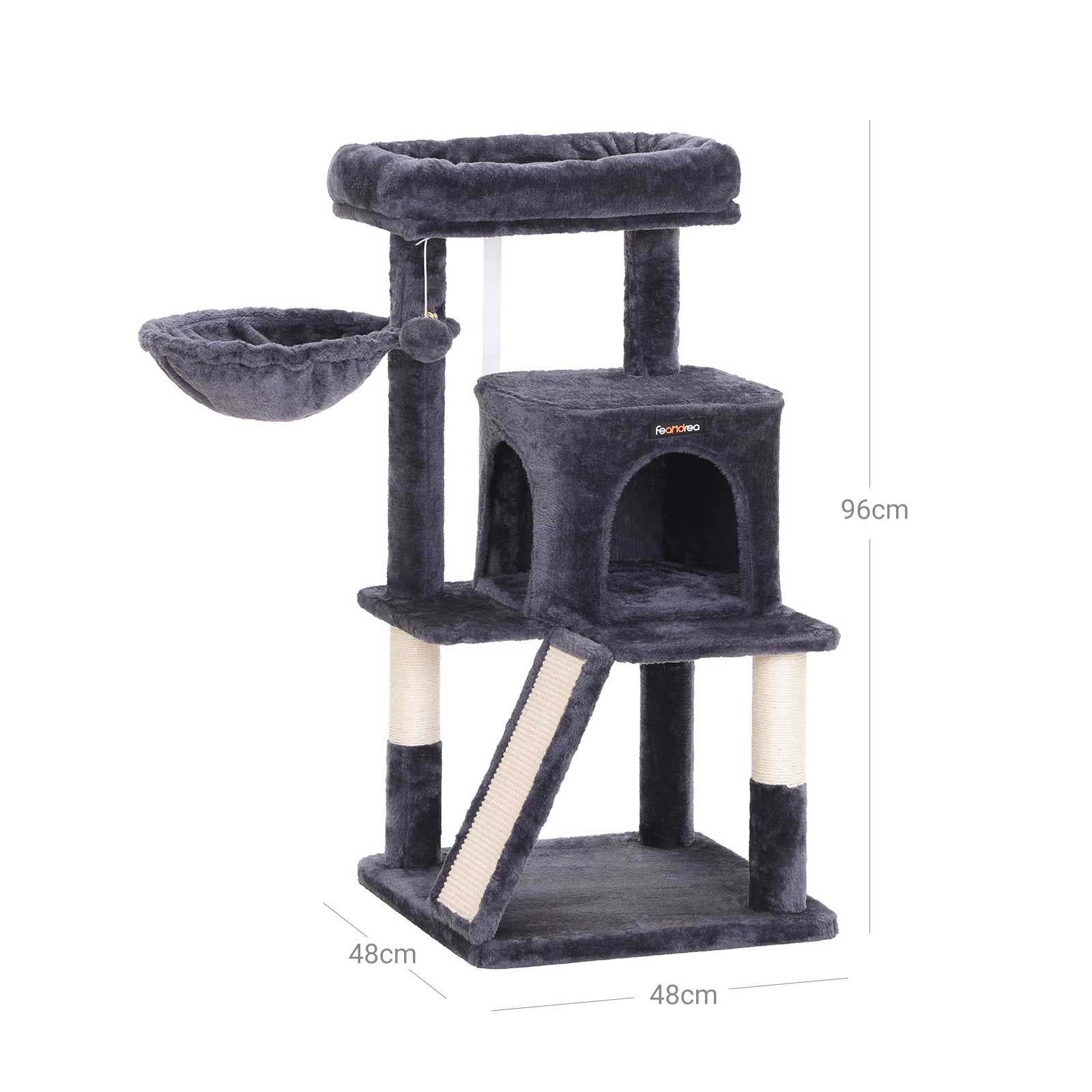 Nepriklausomai nuo to, ar turite jauną kačiuką, ar katę senjorą, šis 48 x 48 x 96 cm didelis kačių bokštas siūlo namus kiekvienai katei. Kuri mūsų draskyklės dalis patiks jūsų katei? Manote, kad ji negalės nustoti galandusi nagų ant įbrėžimų lentos?