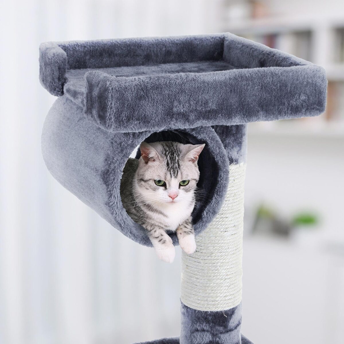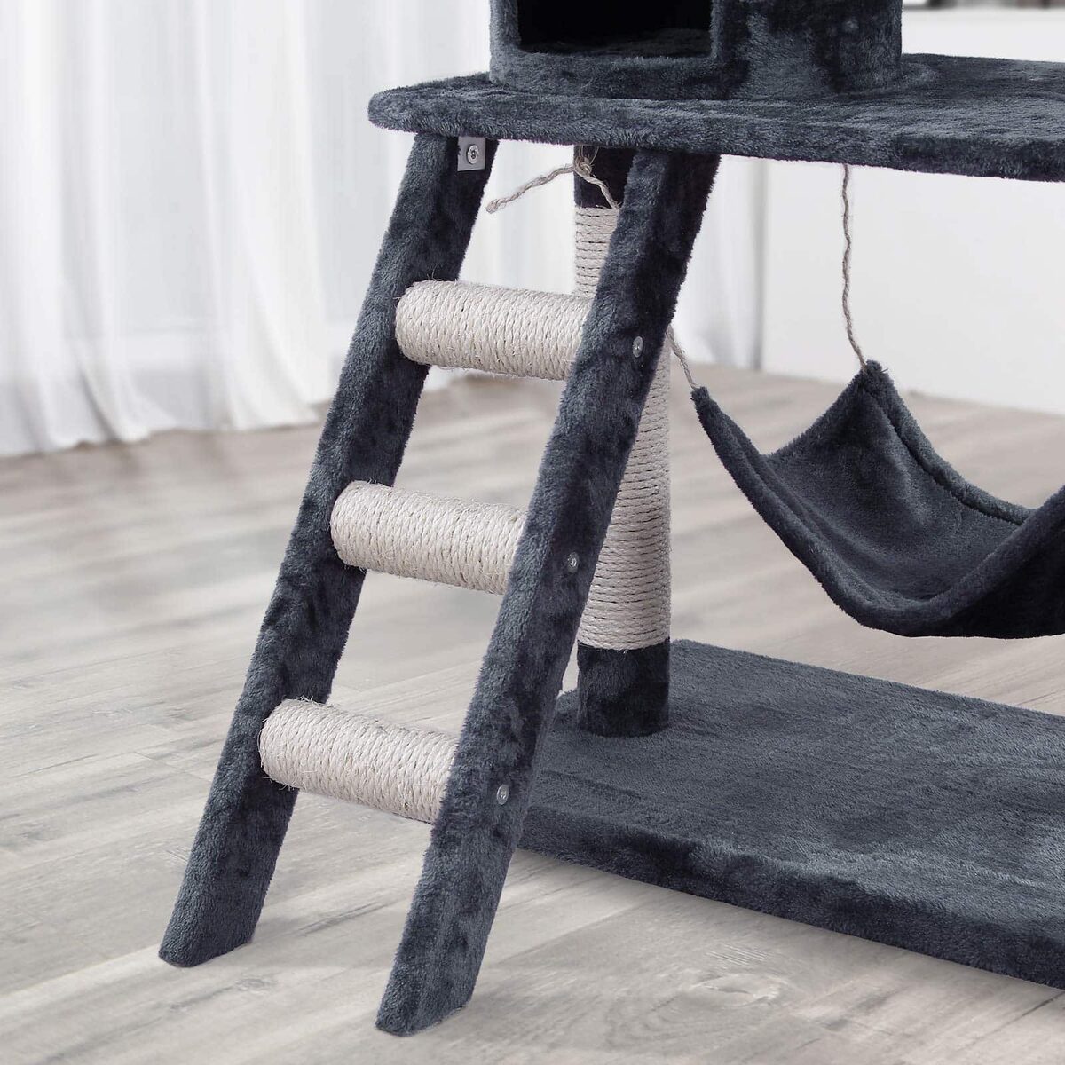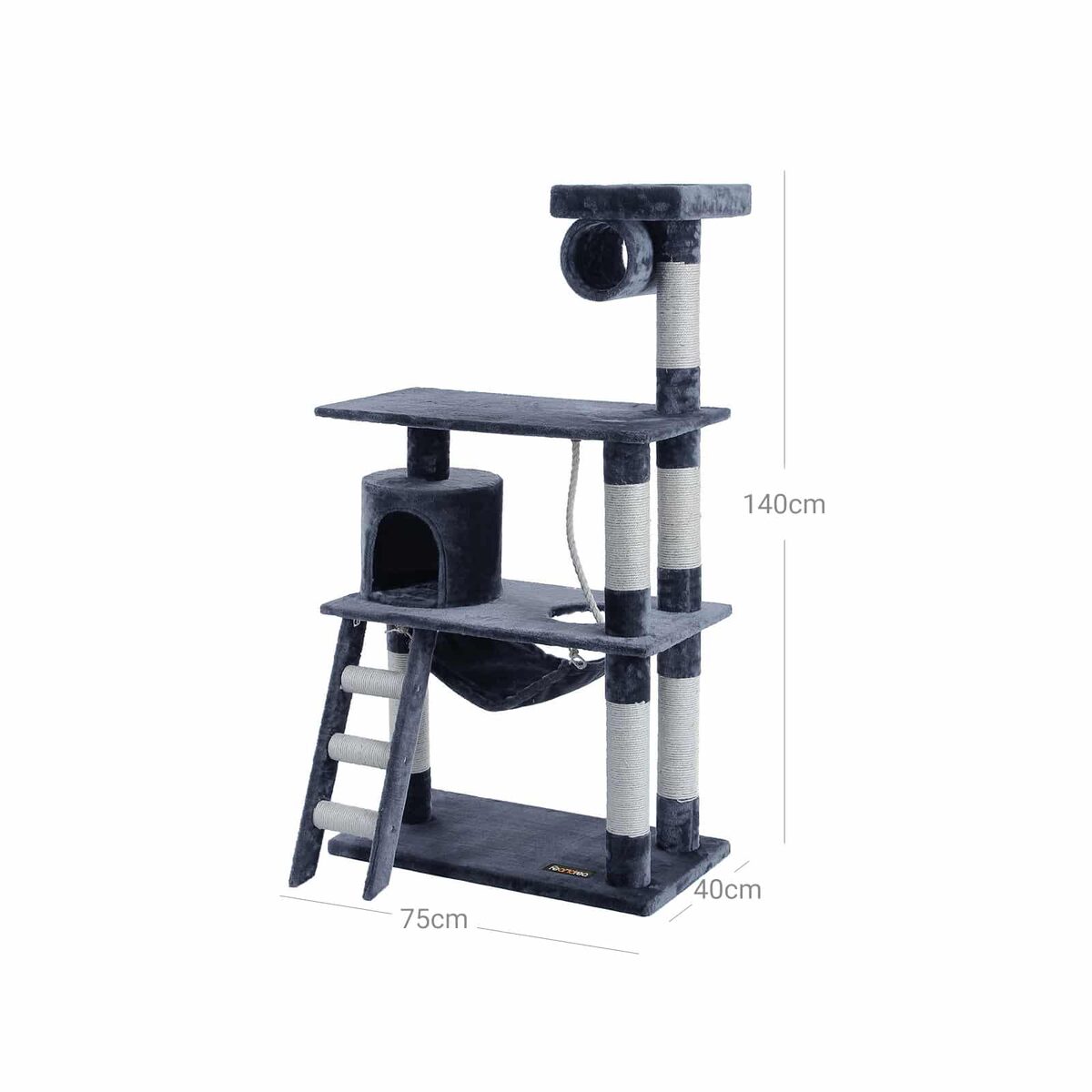 Draskyklė namelis su hamaku ir laiptais 140 cm, tamsiai pilkos spalvos, yra madingo dizaino braižymo stulpelių derinys. Dėl didelės pagrindo plokštės ir pastorintų kolonų jis užtikrina tvirtą ir stabilią konstrukciją. Šis katės medis idealiai tinka kelioms katėms, suteikdamas daug vietos pasislėpti, miegoti ar šėlti.