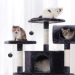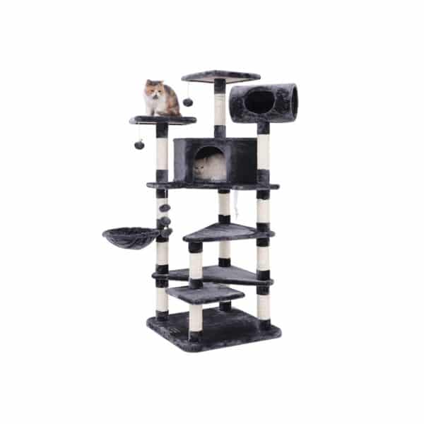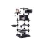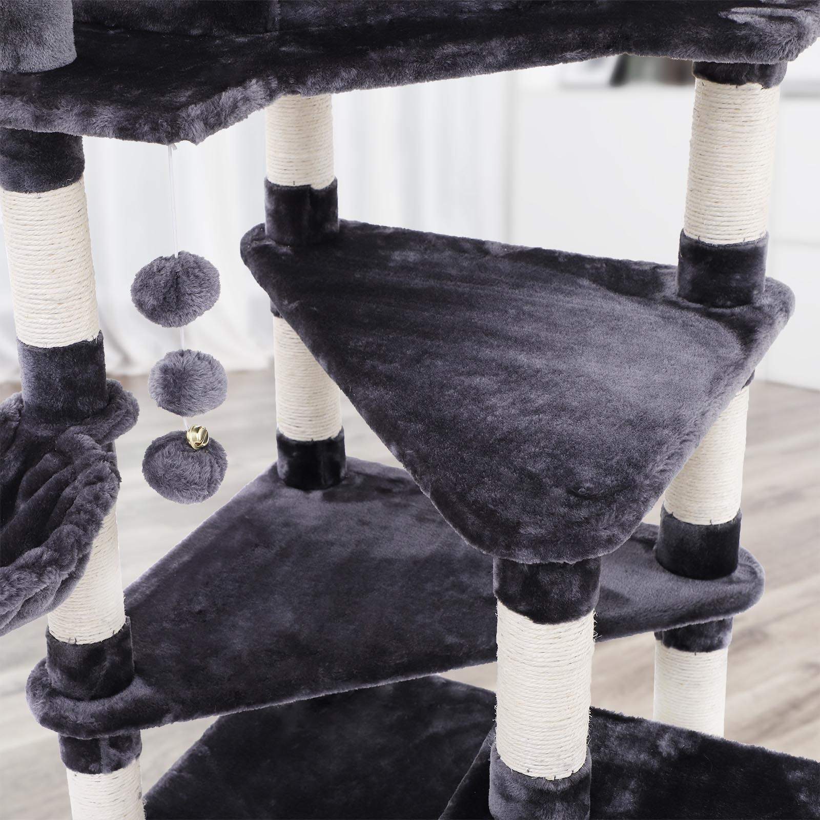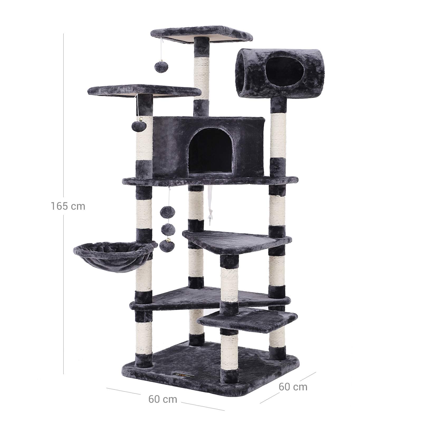 Songmics kačių draskymo stulpelis sujungia aukštą kokybę ir universalumą, siūlydamas įvairias žaidimų zonas ir žaislus. Pagrindo plokštė pagaminta iš aukštos kokybės medžio drožlių plokštė (MDP) , o visi stulpeliai yra apvynioti sizaliu, kad jūsų katės galėtų juos kasytis, kaip nori. Prabangus kačių urvas suteikia didelę netrukdomą poilsio vietą. Be to, kamuoliukai jūsų katėms gali suteikti daug malonumo. Tvirta pagrindo plokštė ir komplekte esantis neapsvyrantis dirželis užtikrina katės medžio stabilumą ir patvarumą. Naudodami šią draskyklę, jūsų katės gali mėgautis laipiojimu medžiais namuose.