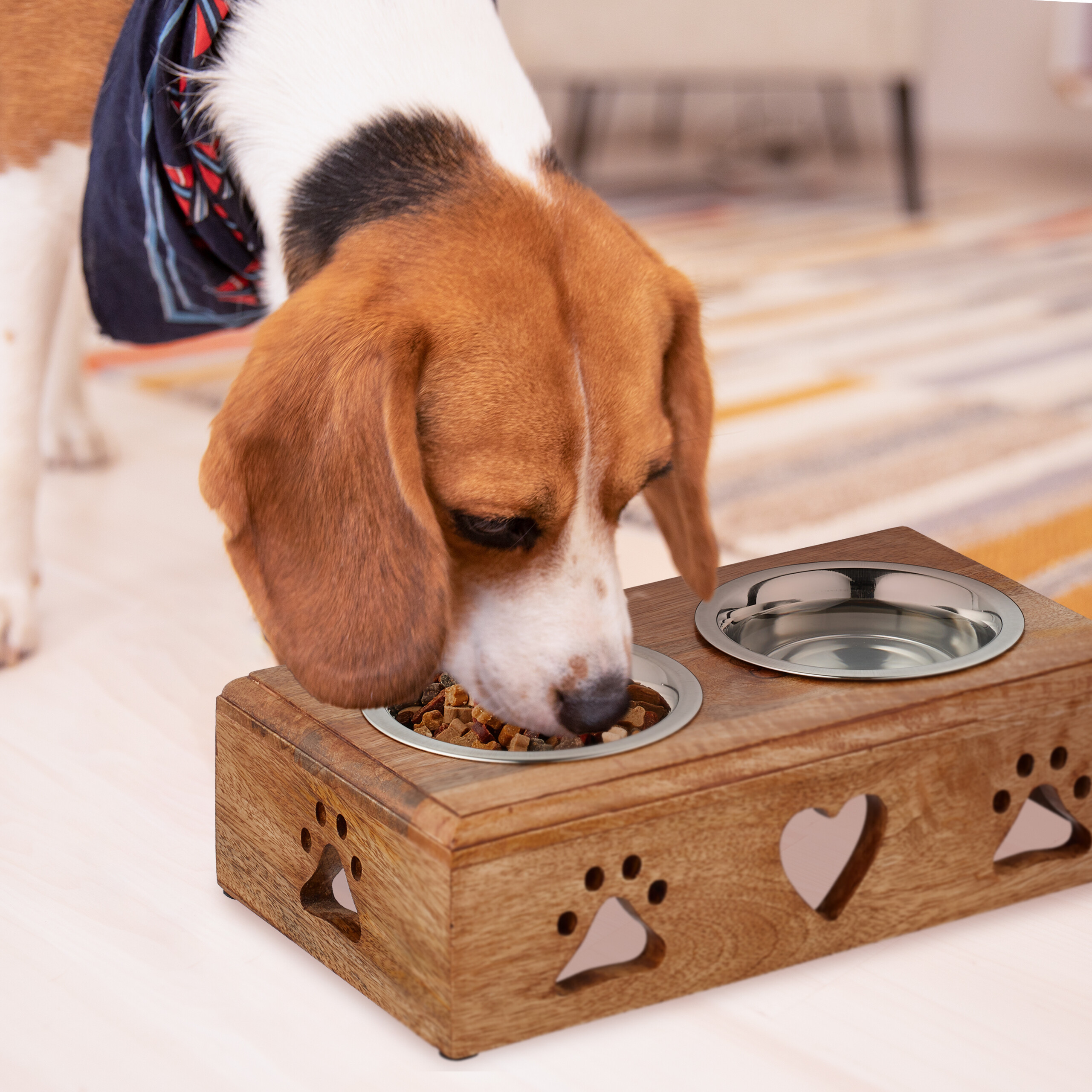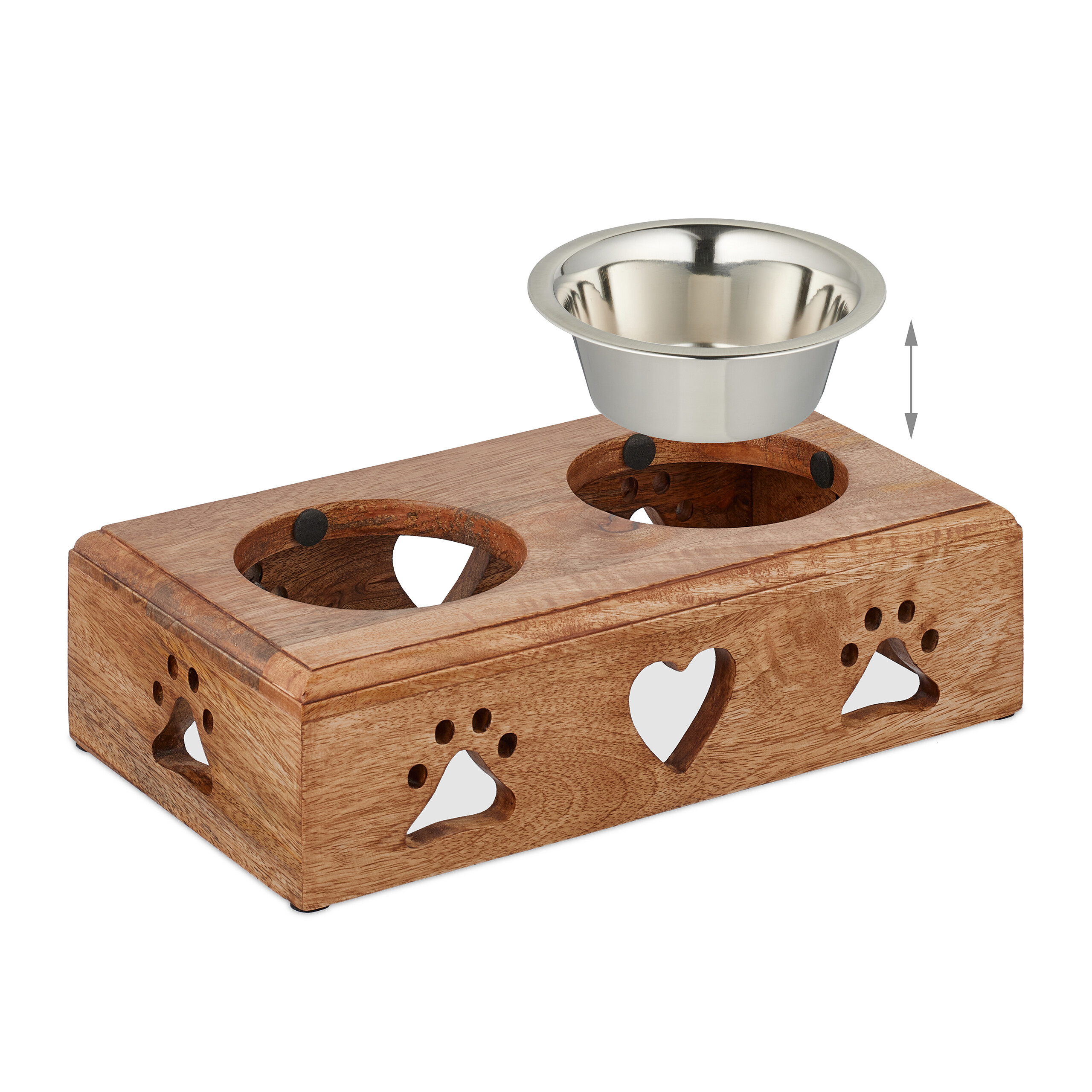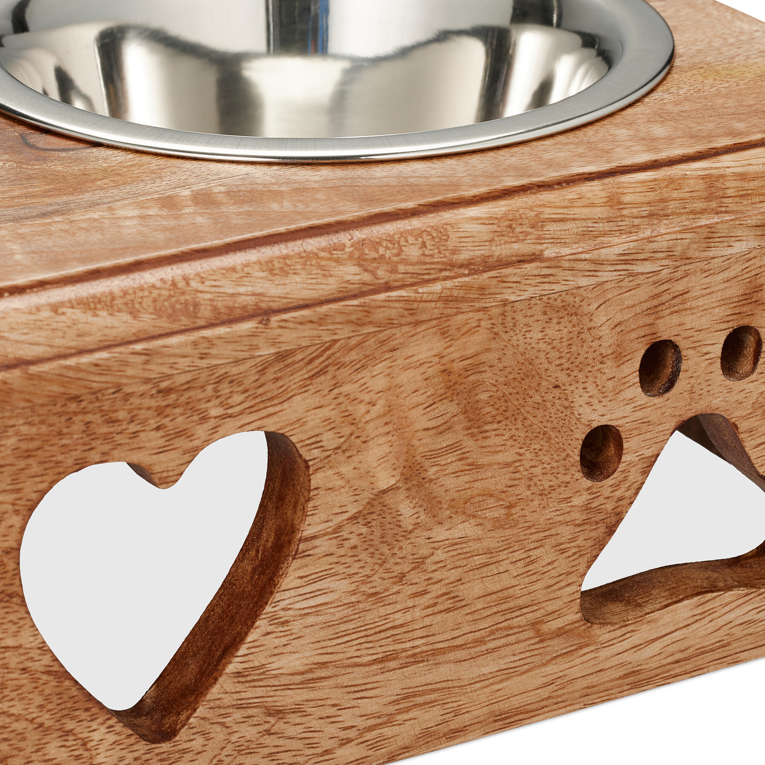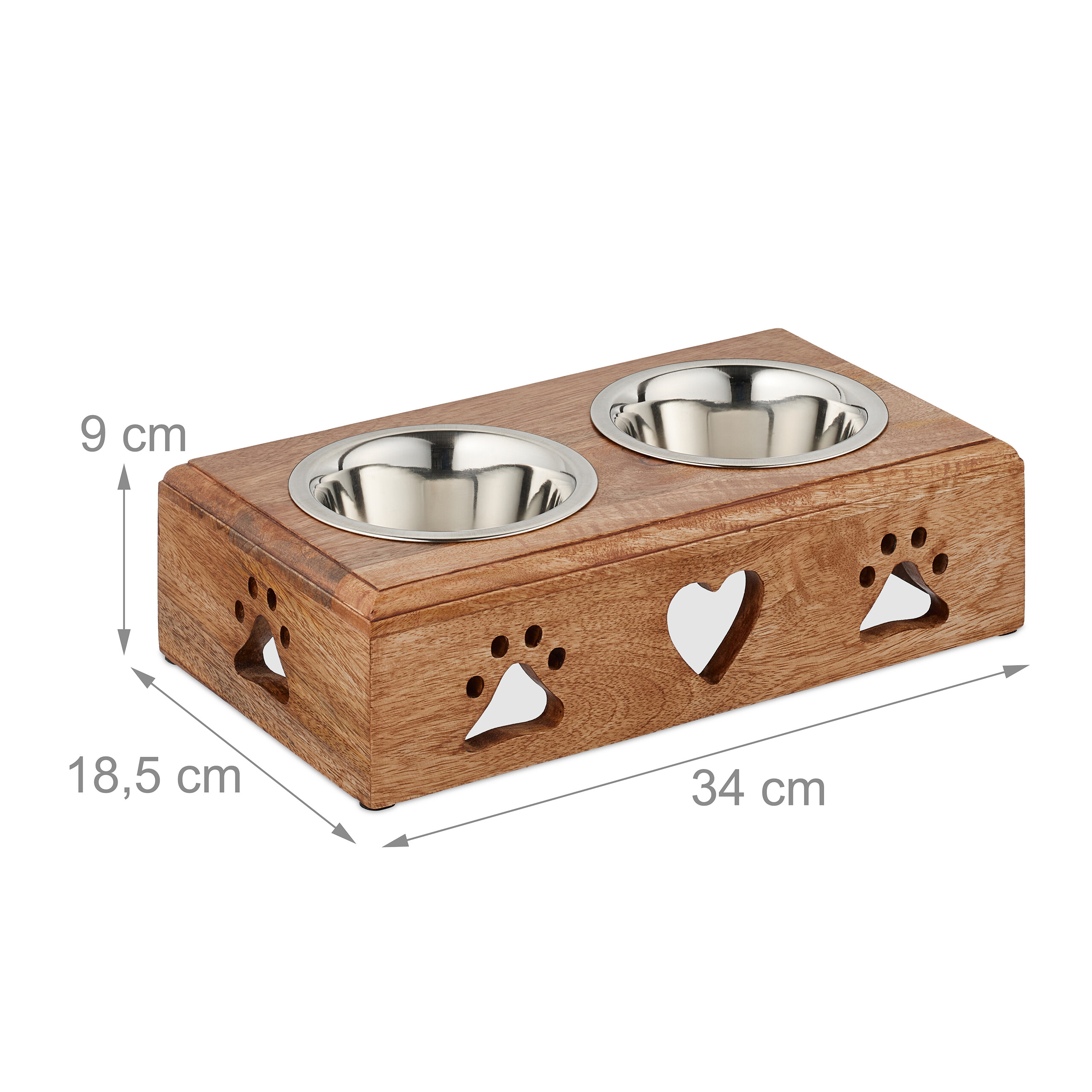 - Aukštos kokybės medžiagos: Dubenėliai pagaminti iš nerūdijančio plieno, kuris yra atsparus korozijai ir lengvai valomas. Stovas pagamintas iš natūralios mango medienos, suteikiančios natūralų ir šiltą išvaizdą.