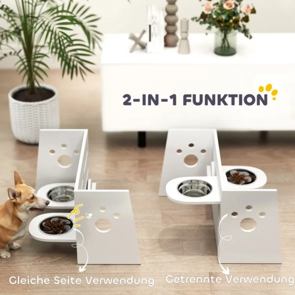 Sumanus šių PawHut šunų dubenėlių dizainas suteikia keliems augintiniams atskiras ir paaukštintas maitinimo vietas. Sureguliuokite aukštį pagal savo šuns dydį ir naudokitės komplekte esančiu kilimėliu, kuris skatina virškinimą ir sumažina stropų skaičių. Be to, šunų dubenėlių komplekto nuimami nerūdijančio plieno dubenėliai labai palengvina valymą!