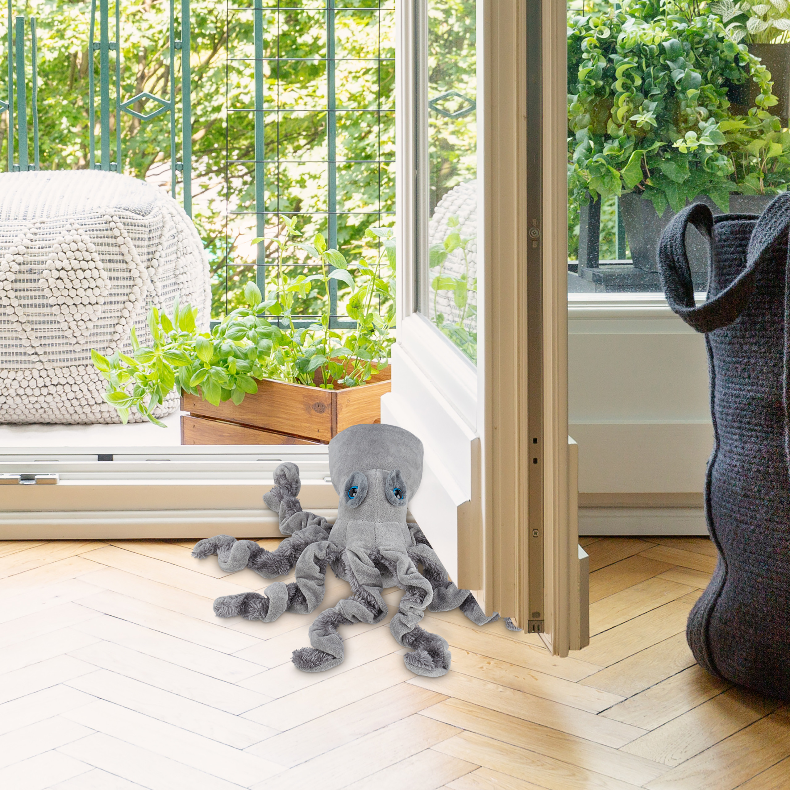 Funkcionalumas: Dėl didelio užpildo, aštuonkojis efektyviai išlaiko kambario duris atidarytas, apsaugodamas jas nuo atsitrenkimo į baldus ar sienas.